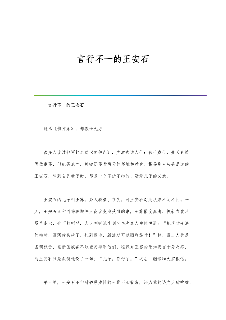 言行不一的王安石 言行不一的王安石 能焉《伤仲永》,却教子无方 很多人读过他写的名篇《伤仲永》,文章告诫人们:孩子成长,先天素质固然重要,但能否成才,关键还要看后天的环境和教育指导别人头头是道的王安石,轮到自己教子时,却是一个不折不扣的、溺爱儿子的父亲 王安石的儿子叫王雾,为人骄横、狂妄,可王安石对此从来不闻不问一天,王安石正和同僚程颢等人商议变法受阻的事,王雾散发赤脚、披着衣裳从屋里走出,也不打招呼,大大咧咧地坐到父亲和客人中间嚷道:“把反对变法的韩琦、富弼的头砍了,挂到闹市,新法就可以顺利施行!”韩、富二人都是当朝权贵,皇亲国戚都不敢轻易得罪他们程颢对王雾的无知妄言十分反感,而王安石只是淡淡地说了一句:“儿子,你错了之后,继续和大家谈话 平日里,王安石不但对骄纵成性的王雾不加管束,还为他的诗文大肆吹嘘,并指使亲信到神宗面前保荐他熙宁九年(1076年),王雾迁龙图阁直学士,一下子成为侍从皇帝的官员,真可谓青云直上 大谈任人唯贤,滥用小人成害 王安石早年有一篇《上仁宗皇帝言事书》,其中对于如何提拔、选取人才颇有见地只可惜,他后来又犯了言行不一的老毛病,口头上讲用人要从长计议,任人唯贤,而实际上他任用的都是些什么人呢? 他的主要助手吕惠卿被史书描绘为“奸邪不可用”,在变法遇到挫折时,就对王安石落井下石,甚至图谋取而代之。