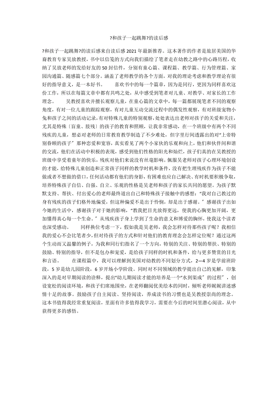 和孩子一起跳舞?的读后感?和孩子一起跳舞?的读后感来自读后感2021年最新推荐这本著作的作者是旅居美国的华裔教育专家吴放教授,书中以信笺的方式向我们描绘了笔者走在幼教之路中的心路历程,收纳了吴放老师的发给好友的50封信件,分别有童心篇、课程篇、教学篇、行为管理篇、家园沟通篇、随感篇七个部分涵盖了老师教学的各个方面,对我的理论考虑和教学理论有很好的指导意义,是一本好书 喜欢书中的每一个篇章,因为是同行,更因为同样喜欢这份工作,所以在每篇文章中都有共鸣之处,从中感受到笔者对儿童、对教学、对家长的工作理念 吴教授喜欢并擅长观察儿童,在童心篇的文章中,每一篇都展现笔者不同的观察角度,有对一位儿童的跟踪观察,有对儿童互动交流过程中的偶发性观察,有对班级宠物小兔和孩子之间的活动记录,有对特殊儿童的特别观察,处处表达出老师对孩子的关爱和关注,尤其是特殊〔盲童、肢残〕的孩子的教育和照顾,让我非常感动,在一个班级中有两个不同残疾的儿童,想必对老师的日常教育教学制造了不少难处,但字里行间透露出的对“上帝特别眷顾的孩子〞那种恋爱和宽容,真实看见了两个小家伙的乐观和向上,他们和伙伴间和谐的交流,他们在活动中积极的表现,感受到他们性格的阳光和灿烂,孩子们真的在吴教授的班级中享受着童年的快乐,残疾对他们来说没有丝毫影响。