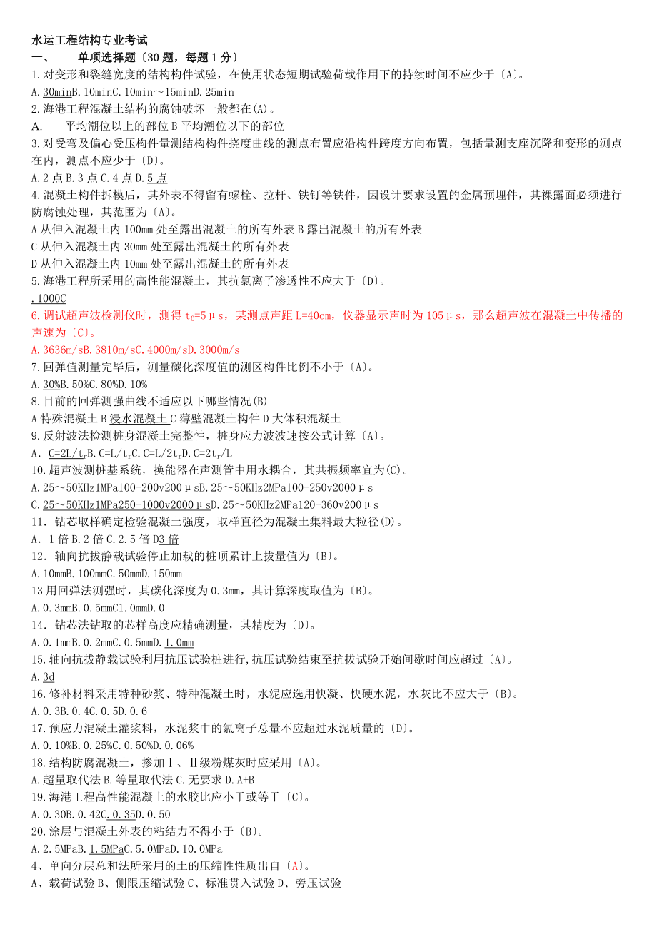 水运工程结构专业考试一、 单项选择题〔30题,每题1分〕1.对变形和裂缝宽度的结构构件试验,在使用状态短期试验荷载作用下的持续时间不应少于〔A〕A.30minB.10minC.10min~15minD.25min2.海港工程混凝土结构的腐蚀破坏一般都在(A)A. 平均潮位以上的部位B平均潮位以下的部位3.对受弯及偏心受压构件量测结构构件挠度曲线的测点布置应沿构件跨度方向布置,包括量测支座沉降和变形的测点在内,测点不应少于〔D〕A.2点B.3点C.4点D.5点4.混凝土构件拆模后,其外表不得留有螺栓、拉杆、铁钉等铁件,因设计要求设置的金属预埋件,其裸露面必须进行防腐蚀处理,其范围为〔A〕A从伸入混凝土内100mm处至露出混凝土的所有外表B露出混凝土的所有外表C从伸入混凝土内30mm处至露出混凝土的所有外表D从伸入混凝土内10mm处至露出混凝土的所有外表5.海港工程所采用的高性能混凝土,其抗氯离子渗透性不应大于〔D〕1000C6.调试超声波检测仪时,测得t0=5μs,某测点声距L=40cm,仪器显示声时为105μs,那么超声波在混凝土中传播的声速为〔C〕A.3636m/sB.3810m/sC.4000m/sD.3000m/s7.回弹值测量完毕后,测量碳化深度值的测区构件比例不小于〔A〕。