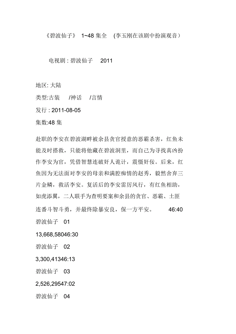 《碧波仙子》 1~48 集全 (李玉刚在该剧中扮演观音)电视剧 : 碧波仙子 2011地区: 大陆类型:古装 /神话 /言情发行 : 2011-08-05集数:48 集赴职的李安在碧波湖畔被余县贪官授意的恶霸杀害,红鱼未能及时搭救,只能将他藏在碧波洞里,而自己为寻找真凶扮作李安为官,凭借智慧连破奸人诡计,震慑奸佞后来,红鱼因为无法面对李安的母亲和满腔痴情的赵秀,毅然舍弃三片金鳞,救活李安复活后的李安雷厉风行,有红鱼相助,如虎添翼,二人联手为查明要案和余县的贪官、恶霸、土匪连番斗智斗勇,并最终除暴安良,保一方平安 46:40碧波仙子 0113,668,58046:30碧波仙子 023,300,41346:13碧波仙子 032,526,29547:02碧波仙子 042,414,92346:26碧波仙子 052,077,59746:32碧波仙子 061,854,59747:01碧波仙子 071,793,07546:57碧波仙子 081,884,79146:51碧波仙子 091,639,30546:48碧波仙子 101,674,11446:53碧波仙子 111,577,81346:16碧波仙子 121,480,34446:15碧波仙子 131,477,52246:35碧波仙子 141,492,44146:48碧波仙子 151,480,04446:48碧波仙子 161,372,29846:44碧波仙子 171,329,30547:02碧波仙子 181,286,70347:01碧波仙子 191,284,60746:59碧波仙子 201,325,55646:55碧波仙子 211,260,53647:02碧波仙子 221,251,70546:29碧波仙子 231,233,58747:06碧波仙子 241,207,62346:59碧波仙子 251,139,52447:05碧波仙子 261,152,88346:54碧波仙子 271,167,80647:02碧波仙子 281,196,25646:49碧波仙子 291,173,52647:07碧波仙子 301,199,04547:03碧波仙子 311,170,92846:56碧波仙子 321,281,11847:05碧波仙子 331,108,09047:05碧波仙子 341,044,63346:56碧波仙子 351,014,01246:52碧波仙子 36949,76346:54碧波仙子 37891,29647:02碧波仙子 38843,79446:58碧波仙子 39843,30447:01碧波仙子 40885,14946:58碧波仙子 41885,98646:48碧波仙子 42913,11046:28碧波仙子 43881,39846:50碧波仙子 44847,83246:59碧波仙子 45900,91146:49碧波仙子 46943,17146:51碧波仙子 471,006,68946:27碧波仙子 481,929,676。