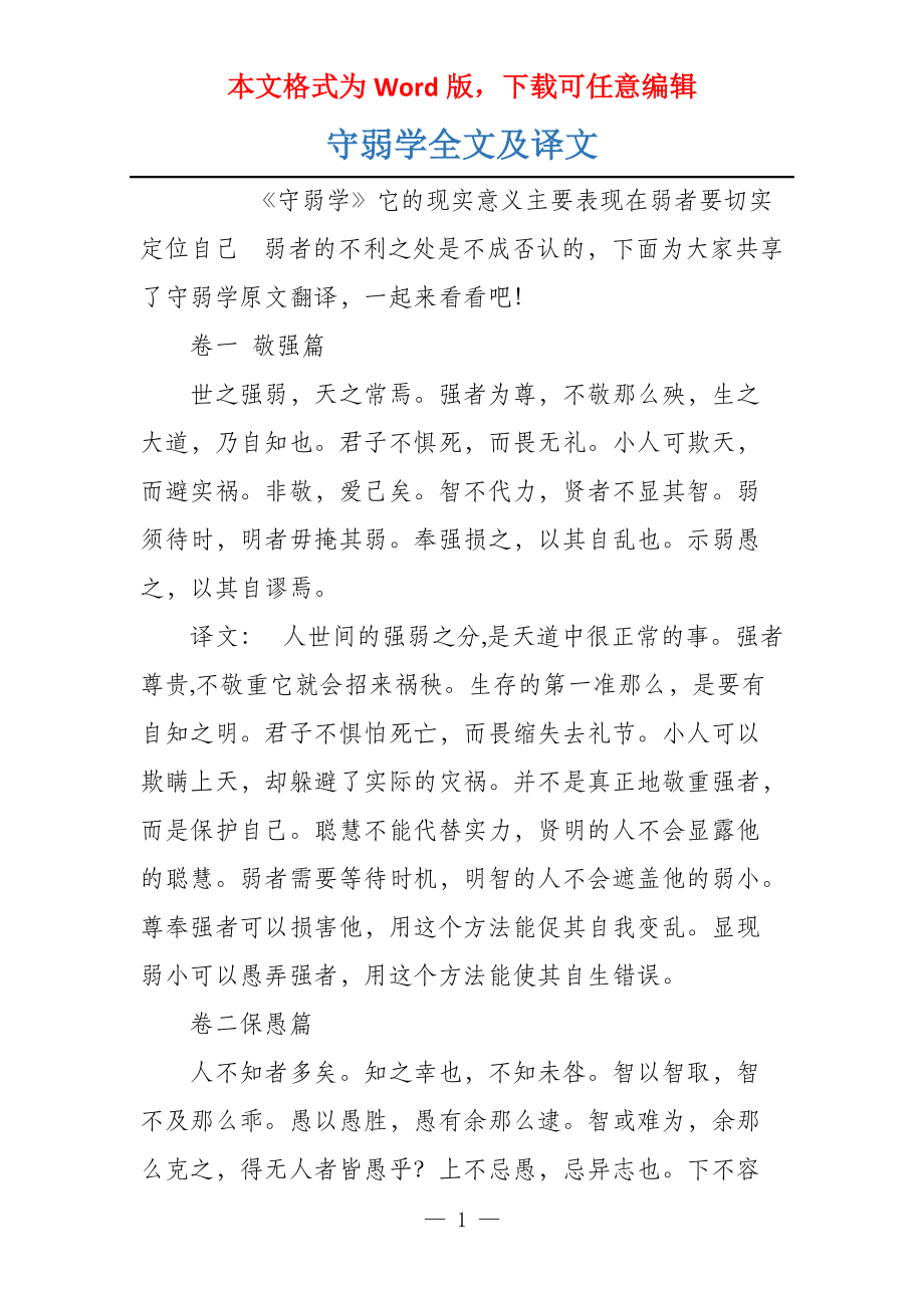 本文格式为Word版,下载可任意编辑守弱学全文及译文 《守弱学》它的现实意义主要表现在弱者要切实定位自己 弱者的不利之处是不成否认的,下面为大家共享了守弱学原文翻译,一起来看看吧! 卷一 敬强篇 世之强弱,天之常焉强者为尊,不敬那么殃,生之大道,乃自知也君子不惧死,而畏无礼小人可欺天,而避实祸非敬,爱己矣智不代力,贤者不显其智弱须待时,明者毋掩其弱奉强损之,以其自乱也示弱愚之,以其自谬焉 译文: 人世间的强弱之分,是天道中很正常的事强者尊贵,不敬重它就会招来祸秧生存的第一准那么,是要有自知之明君子不惧怕死亡,而畏缩失去礼节小人可以欺瞒上天,却躲避了实际的灾祸并不是真正地敬重强者,而是保护自己聪慧不能代替实力,贤明的人不会显露他的聪慧弱者需要等待时机,明智的人不会遮盖他的弱小尊奉强者可以损害他,用这个方法能促其自我变乱显现弱小可以愚弄强者,用这个方法能使其自生错误 卷二保愚篇 人不知者多矣知之幸也,不知未咎智以智取,智不及那么乖愚以愚胜,愚有余那么逮智或难为,余那么克之,得无人者皆愚乎?上不忌愚,忌异志也下不容诈,容有诚也上明而下愚,危亦安。