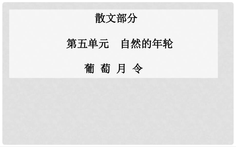 散文部分散文部分第五单元 自然的年轮第五单元 自然的年轮葡葡 萄萄 月月 令令 文本导读文本导读 预习检测预习检测 探究与点拨探究与点拨 栏目链接一、作者简介一、作者简介汪曾祺汪曾祺(1920(1920—1997)1997),江苏高邮人,当代作家、散文家、,江苏高邮人,当代作家、散文家、戏剧家,京派作家的代表人物早年毕业于西南联大,历任戏剧家,京派作家的代表人物早年毕业于西南联大,历任中学教师、北京市文联干部、中学教师、北京市文联干部、《《北京文艺北京文艺》》编辑、北京京剧编辑、北京京剧院编辑在短篇小说创作上颇有成就著有小说集院编辑在短篇小说创作上颇有成就著有小说集《《邂逅集邂逅集》》,小说,小说《《受戒受戒》《》《大淖记事大淖记事》》,散文集,散文集《《蒲桥集蒲桥集》》,改编,改编现代京剧现代京剧《《沙家浜沙家浜》》,大部分作品收录在,大部分作品收录在《《汪曾祺全集汪曾祺全集》》中汪曾祺被誉为汪曾祺被誉为““抒情的人道主义者,中国最后一个纯粹的文抒情的人道主义者,中国最后一个纯粹的文人,中国最后一个士大夫人,中国最后一个士大夫”” 文本导读文本导读 预习检测预习检测 探究与点拨探究与点拨 栏目链接二、整体感知二、整体感知作者通过仔细观察和亲身实践,以作者通过仔细观察和亲身实践,以1212个月份为基本框个月份为基本框架,以葡萄的生长为基本线索,写了葡萄在每个月的生长架,以葡萄的生长为基本线索,写了葡萄在每个月的生长状况,对根、藤、蔓须、叶、果实在不同时节的状态进行状况,对根、藤、蔓须、叶、果实在不同时节的状态进行了描写,同时,更写出了人的劳动,人对葡萄的感情,也了描写,同时,更写出了人的劳动,人对葡萄的感情,也抒发了作者热爱生活、积极乐观的情怀和豁达开朗的人生抒发了作者热爱生活、积极乐观的情怀和豁达开朗的人生态度。