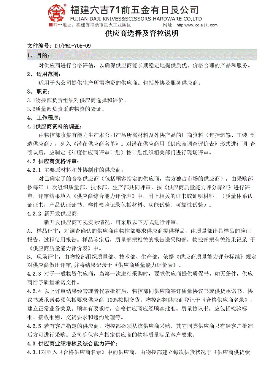 福建穴吉71前五金有日艮公司FUJIAN DAJI KNIVES&SCISSORS HARDWARE CO,LTD■吟••地址:福建省福鼎市星火工业园区网址:http:www. cd a j i . com供应商选择及管控说明文件编号:DJ/PMC-705-091、 目的:对供应商进行合格评估,以确保供应商能长期稳定地提供质优、价格合理的产品和服务2、 适用范围:适用于为公司提供生产所需物资的供应商包括外协及服务供应商3、 职责:3.1物控部负责组织对供应商选择和评价3.2质量部负责采购物资的验证4、 工作程序:4.1供应商资料的调査:由物控部收集有能力生产本公司产品所需材料及外协产品的厂商资料(包括运输、工装 制造供应商),列入《潜在供应商名单》对潜在供应商用《供应商调查评价表》形式进行调 查确认后,应制定《年度供应商评审计划》按计划组织相关部门进行现场评审4.2 供应商资格评审:4.2.1 主要原材料和外协制作的供应商:对已确定了的合格供应商(包括顾客指定的供应商,卖方独占市场的供应商),由采购部 按每年 1 次组织质量部、技术部、生产部共同评审,按《供应商质量能力评分标准》进行评 审,评审结果填入《供应商综合能力评价表》中,附上相关的证书或证明材料。