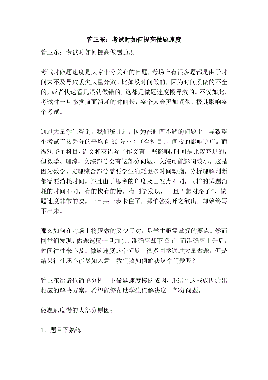 管卫东:考试时如何提高做题速度管卫东:考试时如何提高做题速度管卫东:考试时如何提高做题速度 考试时做题速度是大家十分关心的问题,考场上有很多题都是由于时间来不及导致丢失大量分数比如没时间做的,因为时间紧做的不全的,或者快速看几眼就做错的,这都是做题速度慢导致的不仅如此,考试时一旦感觉前面消耗的时间长,整个人会更加紧张,极其影响整个考试通过大量学生咨询,我们统计过,因为在时间不够的问题上,导致整个考试直接丢分的平均有 30 分左右(全科目) ,间接的影响更广而纵观整个科目,语文和英语除了作文有一些影响,时间是比较充足的,但数学、理综、文综部分会有这部分问题,文综可能影响较小这是因为数学、文理综合部分需要学生消耗更多时间动脑,分析理解判断都需要消耗时间,并且由于思考的角度及出发点不同,同样的试题消耗的时间不同,有的快有的慢,有同学发现,一旦“想对路了” ,做题速度非常的快,一旦某一步卡住了,哪怕答案呼之欲出,却始终写不出来那么如何在考场上将题做的又快又对,是学生亟需掌握的要点然而同学们发现,做题速度一旦加快,准确率却下降了而准确率上升后,时间往往来不及做题速度这个问题,很多同学通过大量做题,但是结果往往还不能尽如人意。