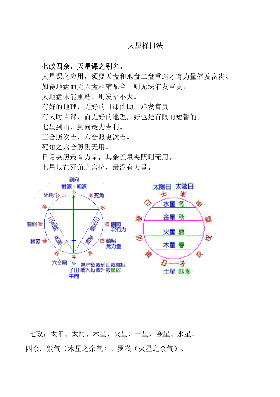 天星择日法 七政四余,天星课之别名 天星课之应用,须要天盘和地盘二盘重迭才有力量催发富贵 如得地盘而无天盘相辅配合,则无法催发富贵; 天地盘未能重迭,则发福不大 有好的地理,无好的日课催助,难发富贵 有天时吉课,而无好的地理,好也是有限而短暂的 七星到山、到向最为吉利 三合照次吉,六合照更次吉 死角之六合照则无用 日月夹照最有力量,其余五星夹照则无用 七星以在死角之宫位,最没有力量 七政:太阳、太阴、木星、火星、土星、金星、水星 四余:紫气(木星之余气)、罗喉(火星之余气)、 计都(土星之余气)、月孛(水星之余气); 太白(金星,带有煞威,因之没有余气) 太阳:一日行一度,一月行一宫,一宫三十度, 一年行一小周天,十九年行一大周天 太阴:月亮,一日行十三度,二日半行一宫, 一月行一小周天,六十年行一大周天 木星:六或七日行一度,大约一年行一宫, 十二年行一周天,八十三年行一大周天 火星:十八小时行一度,五十日行一度 若遇迟留伏逆,二日行一度,二月行一宫。
