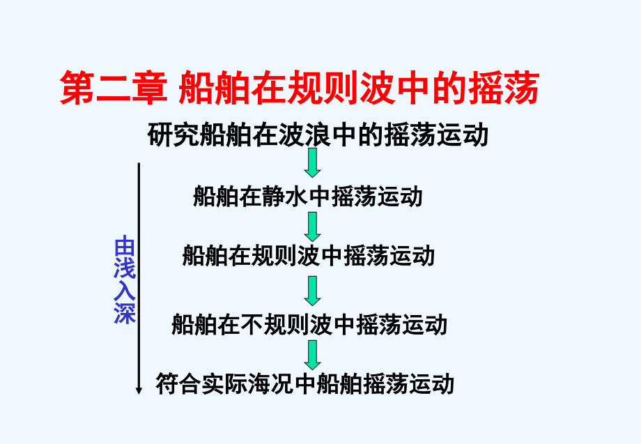 第二章第二章 船舶在规则波中的摇荡船舶在规则波中的摇荡研究船舶在波浪中的摇荡运动研究船舶在波浪中的摇荡运动船舶在静水中摇荡运动船舶在静水中摇荡运动船舶在规则波中摇荡运动船舶在规则波中摇荡运动船舶在不规则波中摇荡运动船舶在不规则波中摇荡运动符合实际海况中船舶摇荡运动符合实际海况中船舶摇荡运动由由浅浅入入深深 重点重点:船舶在规则波中的线性横摇船舶在规则波中的线性横摇,航速航向影响航速航向影响.难点难点:考虑非线性影响的共振横摇角计算考虑非线性影响的共振横摇角计算船舶在规则波中的摇荡规则波简介规则波简介线性横摇线性横摇非线性共非线性共振横摇角振横摇角迎浪纵摇迎浪纵摇和垂荡和垂荡航速、航航速、航向影响向影响规则波要素1质点 轨圆运动2波内压力场3表观重力 波浪扰动力矩 横摇方程及解放大因数概念一般非线性阻尼共振角规范横摇角纵摇垂荡运动方程及解纵摇垂荡主干扰力遭遇频率概念对干扰力频率幅值影响斜斜斜斜浪浪斜浪中线性放大因数第二章第二章 船舶在规则波中的摇荡船舶在规则波中的摇荡第一节第一节 规则余弦波规则余弦波规则余弦波规则余弦波定义:定义:波面可以用简单函数表达的波浪称为规则波,波面可以用简单函数表达的波浪称为规则波,而波形轮廓是余弦曲线的规则波为余弦波。