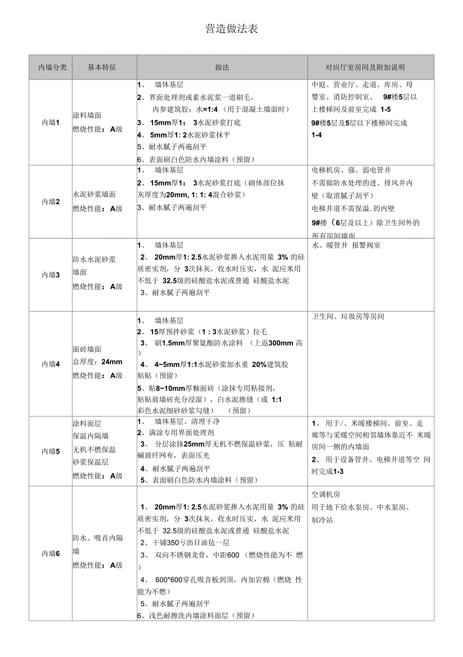 营造做法表内墙分类基本特征做法对应厅室房间及附加说明内墙1涂料墙面燃烧性能:A级1、 墙体基层2、 界面处理剂或素水泥浆一道刷毛,内参建筑胶:水=1:4 (用于混凝土墙面时)3、 15mm厚1: 3水泥砂浆打底4、 5mm厚1: 2水泥砂浆抹平5、 耐水腻子两遍刮平6、 表面刷白色防水内墙涂料(预留)中庭、营业厅、走道、库房、母婴室、消防控制室、 9#楼5层以上楼梯间及前室完成 1-59#楼5层及5层以下楼梯间完成1-4内墙2水泥砂浆墙面燃烧性能:A级1、 墙体基层2、 15mm厚1: 3水泥砂浆打底(砌体部位抹灰厚度为20mm, 1: 1: 4混合砂浆)3、 耐水腻子两遍刮平电梯机房、强、弱电管井不需做防水处理的进、排风井内壁(取消腻子刮平)电梯井道不需保溢.的内壁9#楼(6层及以上)除卫生间外的所有房间墙面内墙3防水水泥砂浆墙面燃烧性能:A级1、 墙体基层2、 20mm厚1: 2.5水泥砂浆掺入水泥用量 3% 的硅质密实剂,分 3次抹灰,收水时压实,水 泥应米用不低于 32.5级的硅酸盐水泥或普通 硅酸盐水泥3、 耐水腻子两遍刮平水、暖管井 报警阀室内墙4面砖墙面总厚度:24mm燃烧性能:A级1、 墙体基层2、 15厚预拌砂浆(1 : 3水泥砂浆)拉毛3、 刷1.5mm厚聚氨酯防水涂料 (上返300mm 高)4、 4~5mm厚1:1水泥砂浆加水重 20%建筑胶粘贴(预留)5、 贴8~10mm厚釉面砖(涂抹专用粘接剂,粘贴前墙砖充分浸湿),白水泥擦缝(或 1:1彩色水泥细砂砂浆勾缝) (预留)卫生间、垃圾房等房间内墙5涂料面层保温内隔墙无机不燃保温砂浆保温层燃烧性能:A级1、 墙体基层、清理干净2、 满涂专用界面处理剂3、 分层涂抹25mm厚无机不燃保温砂浆,压 粘耐碱玻纤网布,表面压光4、 耐水腻子两遍刮平5、 表面刷白色防水内墙涂料(预留)1、 用于/、米暖楼梯间、前室、走 廊等与采暖空间相邻墙体靠近不 米暖房间一侧的内墙面2、 用于设备管井、电梯井道等空 间时完成1-3内墙6防水、吸首内隔墙燃烧性能:A级1、 20mm厚1: 2.5水泥砂浆掺入水泥用量 3% 的硅质密实剂,分 3次抹灰,收水时压实,水 泥应米用不低于 32.5级的硅酸盐水泥或普通 硅酸盐水泥2、 干铺350亏沥目油毡一层3、 双向不锈钢龙骨,中距600 (燃烧性能为不 燃)4、 600*600穿孔吸音板到顶,内加岩棉(燃烧 性能为不燃)5、 耐水腻子两遍刮平6、 浅色耐擦洗内墙涂料面层(预留)空调机房用于地下给水泵房、中水泵房、制冷站内墙分类基本特征做法对应厅室房间及附加说明内墙7吸音内隔墙燃烧性能:A级1、 结构面清理干净2、 12厚1:2水泥砂浆3、 6厚1:3水泥砂浆4、 干铺350号沥青油毡一层5、 双向不锈钢龙骨,中距600 (燃烧性能为不 燃)6、 600*600穿孔吸音板到顶,内加岩棉(燃烧 性能为不燃)用于地下排烟机房、补风机房 电影厅完成1-3内墙8干挂石材墙面 燃烧性能:A级1、 墙体基层处理干净2、 竖向不锈钢龙骨,龙骨用膨胀螺栓锚固于 墙面基层钢筋混凝土结构中3、 横向不锈钢龙骨4、 花岗岩板材,用环氧树脂固定稍钉,石缝 用硅酮密封胶填缝具体位置及龙骨、石材尺寸,详 见精装修设计(龙骨为不燃材料)内墙9屏敝墙面水泥基渗透结晶防水墙面1、 钢筋混凝土墙面清理2、 2mm厚水泥基渗透结晶防水材料3、 1mm厚水泥基渗透结晶防水材料4、 15厚1: 3水泥砂浆找平5、 5厚1:2水泥砂浆抹灰层中铺贴 力1*10*10 镀锌钢丝网,与接地装置连接。