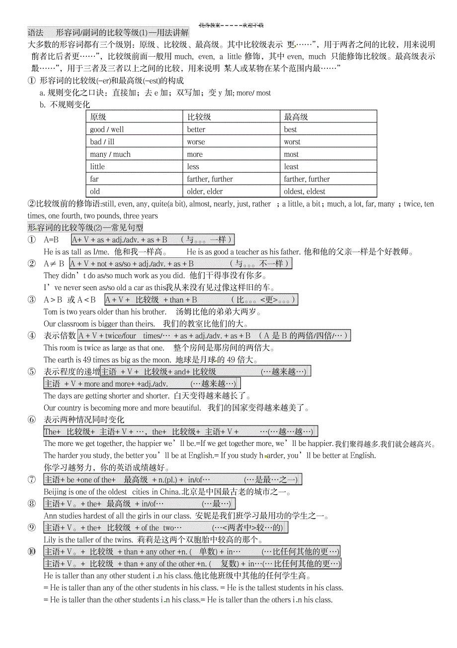 优秀教案 欢迎下载 语法 形容词/副词的比较等级(1)—用法讲解 大多数的形容词都有三个级别:原级、比较级、最高级其中比较级表示“ 更……” ,用于两者之间的比较,用来说明“ 前者比后者更……” ,比较级前面一般用 much, even, a little 修饰,其中 even, much 只能修饰比较级最高级表示“ 最……” ,用于三者及三者以上之间的比较,用来说明“ 某人或某物在某个范围内最……” ① 形容词的比较级(-er)和最高级(-est)的构成 a. 规则变化之口诀:直接加;去 e 加;双写加;变 y 加; more/ most b. 不规则变化 原级 比较级 最高级 good / well better best bad / ill worse worst many / much more most little less least far farther, further farther, further old older, elder oldest, eldest ②比较级前的修饰语:still, even, any, quite(a bit), almost, nearly, just, rather ; a little, a bit; much, a lot, far, many ; twice, ten times, one fourth, two pounds, three years 形容词的比较等级(2)—常见句型 ① A=B A+ V + as + adj./adv. + as + B (与。