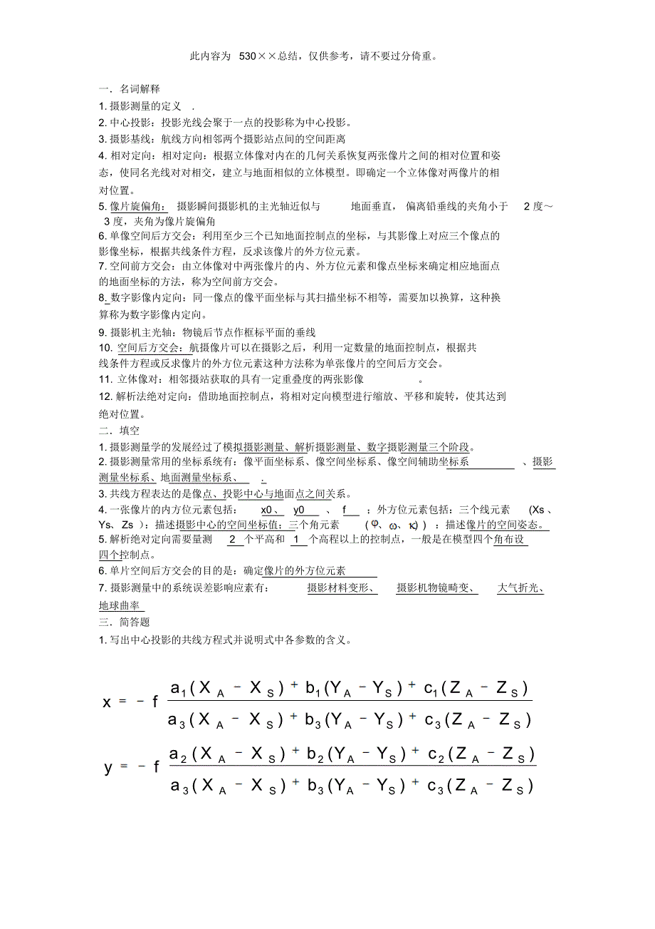 此内容为530××总结,仅供参考,请不要过分倚重一.名词解释1. 摄影测量的定义. 2. 中心投影:投影光线会聚于一点的投影称为中心投影3. 摄影基线:航线方向相邻两个摄影站点间的空间距离4. 相对定向:相对定向:根据立体像对内在的几何关系恢复两张像片之间的相对位置和姿态,使同名光线对对相交,建立与地面相似的立体模型即确定一个立体像对两像片的相对位置5. 像片旋偏角: 摄影瞬间摄影机的主光轴近似与地面垂直, 偏离铅垂线的夹角小于2 度~ 3 度,夹角为像片旋偏角 6. 单像空间后方交会:利用至少三个已知地面控制点的坐标,与其影像上对应三个像点的影像坐标,根据共线条件方程,反求该像片的外方位元素 7. 空间前方交会:由立体像对中两张像片的内、外方位元素和像点坐标来确定相应地面点的地面坐标的方法,称为空间前方交会8. 数字影像内定向:同一像点的像平面坐标与其扫描坐标不相等,需要加以换算,这种换算称为数字影像内定向9. 摄影机主光轴:物镜后节点作框标平面的垂线 10. 空间后方交会:航摄像片可以在摄影之后,利用一定数量的地面控制点,根据共线条件方程或反求像片的外方位元素这种方法称为单张像片的空间后方交会。