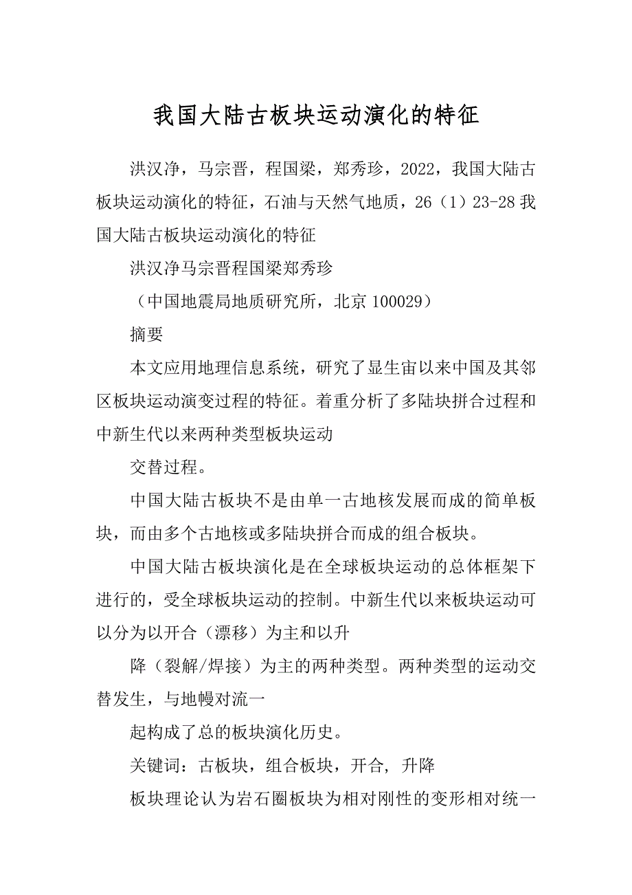 我国大陆古板块运动演化的特征 洪汉净,马宗晋,程国梁,郑秀珍,2022,我国大陆古板块运动演化的特征,石油与天然气地质,26(1)23-28 我国大陆古板块运动演化的特征 洪汉净马宗晋程国梁郑秀珍 (中国地震局地质研究所,北京100029) 摘要 本文应用地理信息系统,研究了显生宙以来中国及其邻区板块运动演变过程的特征着重分析了多陆块拼合过程和中新生代以来两种类型板块运动 交替过程 中国大陆古板块不是由单一古地核发展而成的简单板块,而由多个古地核或多陆块拼合而成的组合板块 中国大陆古板块演化是在全球板块运动的总体框架下进行的,受全球板块运动的控制中新生代以来板块运动可以分为以开合(漂移)为主和以升 降(裂解/焊接)为主的两种类型两种类型的运动交替发生,与地幔对流一 起构成了总的板块演化历史 关键词:古板块,组合板块,开合, 升降 板块理论认为岩石圈板块为相对刚性的变形相对统一的块体,而板块边界变形相对激烈,地球表壳的变形主要由板块边界变形来完成板块学说勾画了一个由宽阔、相对稳定的板块和狭窄、变形激烈的板块边界组成的地球表面运动的空间图象。