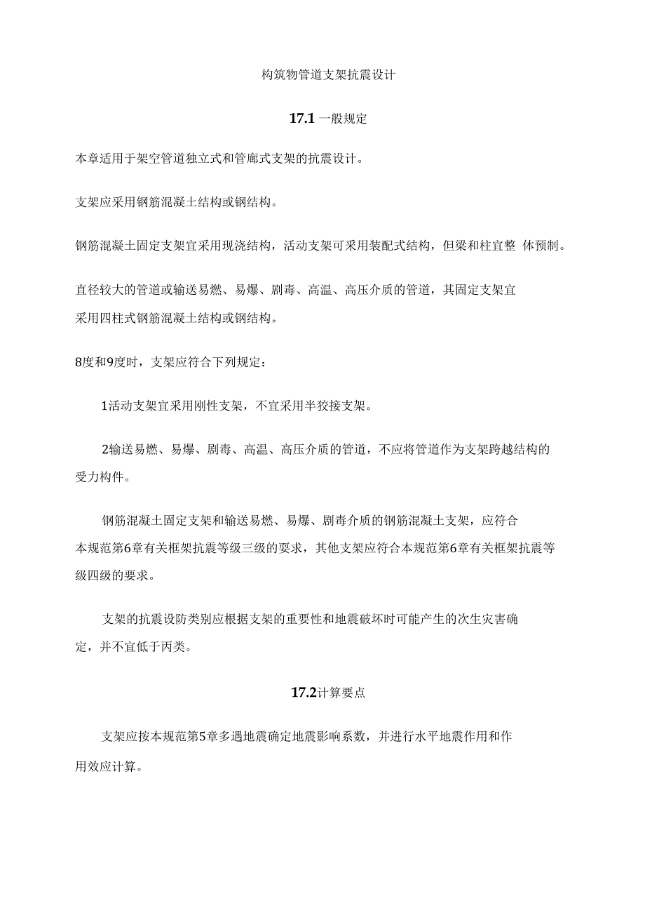 构筑物管道支架抗震设计17.1 一般规定本章适用于架空管道独立式和管廊式支架的抗震设计支架应采用钢筋混凝土结构或钢结构钢筋混凝土固定支架宜采用现浇结构,活动支架可釆用装配式结构,但梁和柱宜整 体预制直径较大的管道或输送易燃、易爆、剧毒、高温、高压介质的管道,其固定支架宜 采用四柱式钢筋混凝土结构或钢结构8度和9度时,支架应符合下列规定:1活动支架宜釆用刚性支架,不宜采用半狡接支架2输送易燃、易爆、剧毒、高温、高压介质的管道,不应将管道作为支架跨越结构的 受力构件钢筋混凝土固定支架和输送易燃、易爆、剧毒介质的钢筋混凝土支架,应符合 本规范第6章有关框架抗震等级三级的耍求,其他支架应符合本规范第6章有关框架抗震等 级四级的要求支架的抗震设防类别应根据支架的重要性和地震破坏时可能产生的次生灾害确 定,并不宜低于丙类17.2计算要点支架应按本规范第5章多遇地震确定地震影响系数,并进行水平地震作用和作用效应计算管道纵向可滑动的刚性活动支架,在管道滑动的方向可不进行抗震验算,但应满足 相应的抗震构造措施要求8度、9度时,柔性活动支架应进行抗震验算管道支架的计算单元(图、图应符合下列规定:1独立式支架的纵向计算单元长度应采用主要管道补偿器中至中的距离,横向计算单 元长度应采用支架相邻两跨中至中的距离。