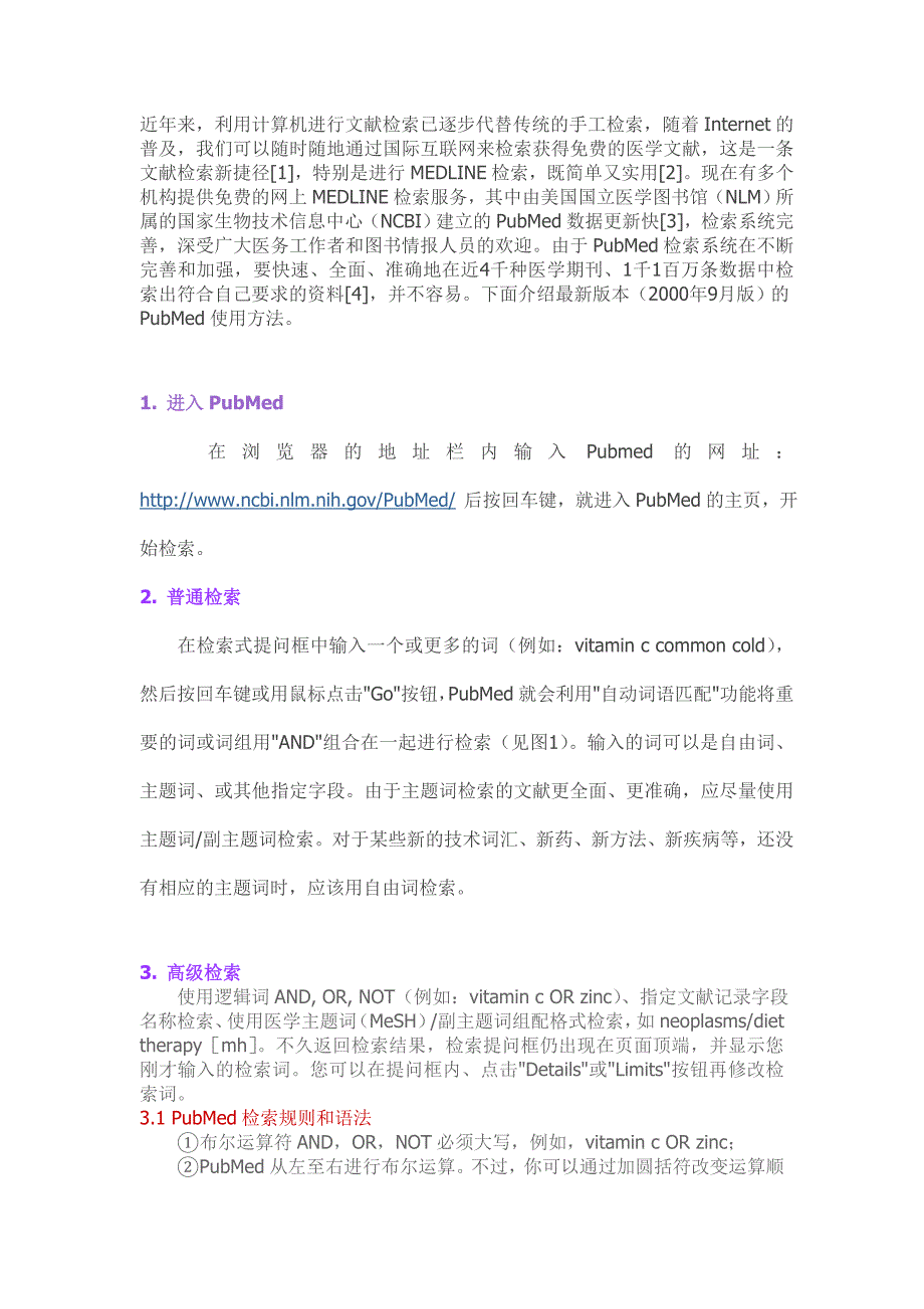 近年来,利用计算机进行文献检索已逐步代替传统的手工检索,随着Internet的普及,我们可以随时随地通过国际互联网来检索获得免费的医学文献,这是一条文献检索新捷径[1],特别是进行MEDLINE检索,既简单又实用[2]现在有多个机构提供免费的网上MEDLINE检索服务,其中由美国国立医学图书馆(NLM)所属的国家生物技术信息中心(NCBI)建立的PubMed数据更新快[3],检索系统完善,深受广大医务工作者和图书情报人员的欢迎由于PubMed检索系统在不断完善和加强,要快速、全面、准确地在近4千种医学期刊、1千1百万条数据中检索出符合自己要求的资料[4],并不容易下面介绍最新版本(2000年9月版)的PubMed使用方法1. 进入PubMed 在浏览器的地址栏内输入Pubmed的网址:http://www.ncbi.nlm.nih.gov/PubMed/ 后按回车键,就进入PubMed的主页,开始检索2. 普通检索 在检索式提问框中输入一个或更多的词(例如:vitamin c common cold),然后按回车键或用鼠标点击"Go"按钮,PubMed就会利用"自动词语匹配"功能将重要的词或词组用"AND"组合在一起进行检索(见图1)。
