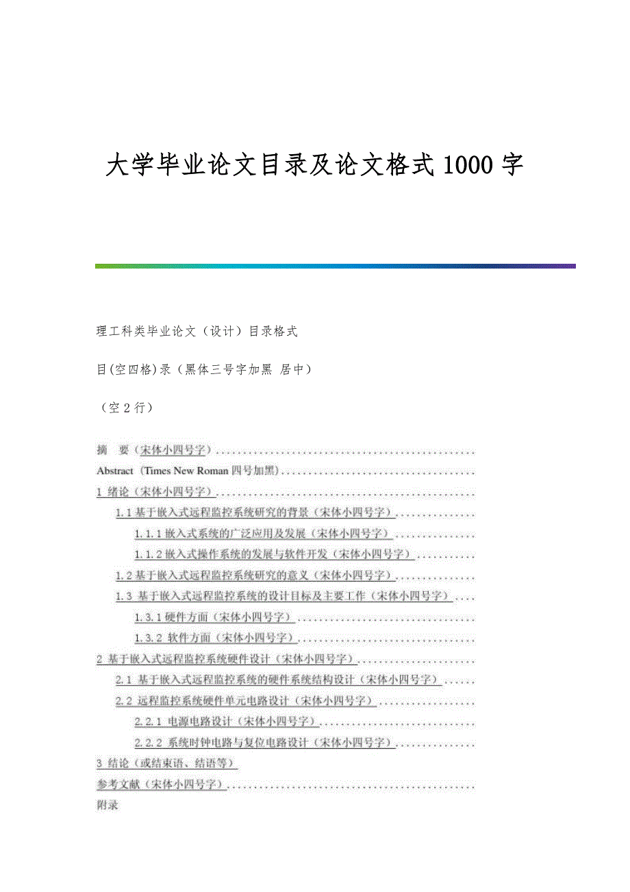 大学毕业论文目录及论文格式1000字 理工科类毕业论文(设计)目录格式目(空四格)录(黑体三号字加黑 居中)(空2行)理工科类毕业论文(设计)基本格式标题 XXXXXXXXXXXXXX(宋体三号字加黑,居中)学生姓名:XX 学号:XXX(五号宋体字不加黑,居中)XXXX学院 XX专业(五号宋体字不加黑,居中)指导教师:XXX 职称:XXX(五号宋体字不加黑,居中)摘 要(黑体小四):具体内容(楷体小四号字不加黑)关键词(黑体小四): **;**;** (楷体小四号字不加黑)(空一行)Abstract(Times New Roman小四加黑):具体内容(Times New Roman小四不加黑)Key words(Times New Roman小四加黑):**;**;** (Times New Roman小四不加黑)1 XXXXXX(一级标题宋体四号加黑)1.1XXXXXX(二级标题宋体小四号加黑)1.1.1XXXXX(三级标题仿宋体小四号)正文内容(宋体小四号不加黑)、图表说明(宋体小五号不加黑)参考文献:详细格式参见《信阳师范学院学报》自然科学版参考文献要求:文献序号标在引用处文字末、句号前,加[]标于右上角。