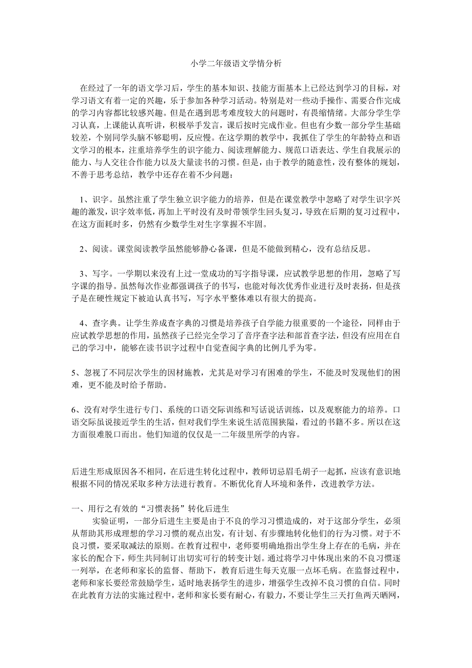 小学二年级语文学情分析 在经过了一年的语文学习后,学生的基本知识、技能方面基本上已经达到学习的目标,对学习语文有着一定的兴趣,乐于参加各种学习活动特别是对一些动手操作、需要合作完成的学习内容都比较感兴趣但是在遇到思考难度较大的问题时,有畏缩情绪大部分学生学习认真,上课能认真听讲,积极举手发言,课后按时完成作业但也有少数一部分学生基础较差,个别同学头脑不够聪明,反应慢在这学期的教学中,我抓住了学生的年龄特点和语文学习的根本,注重培养学生的识字能力、阅读理解能力、规范口语表达、学生自我展示的能力、与人交往合作能力以及大量读书的习惯但是,由于教学的随意性,没有整体的规划,不善于思考总结,教学中还存在着不少问题: 1、识字虽然注重了学生独立识字能力的培养,但是在课堂教学中忽略了对学生识字兴趣的激发,识字效率低,再加上平时没有及时带领学生回头复习,导致在后期的复习过程中,在这方面耗时多,仍然有少数学生对生字掌握不牢固 2、阅读课堂阅读教学虽然能够静心备课,但是不能做到精心,没有总结反思 3、写字一学期以来没有上过一堂成功的写字指导课,应试教学思想的作用,忽略了写字课的指导虽然每次作业都强调孩子的书写,也能对每次优秀作业进行及时表扬,但是孩子是在硬性规定下被迫认真书写,写字水平整体难以有很大的提高。