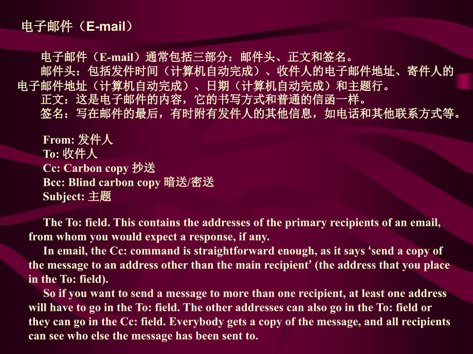 电子邮件(E-mail)电子邮件(E-mail)通常包括三部分:邮件头、正文和签名邮件头:包括发件时间(计算机自动完成)、收件人的电子邮件地址、寄件人的 电子邮件地址(计算机自动完成)、日期(计算机自动完成)和主题行正文:这是电子邮件的内容,它的书写方式和普通的信函一样签名:写在邮件的最后,有时附有发件人的其他信息,如和其他联系方式等 From: 发件人 To: 收件人 Cc: Carbon copy 抄送 Bcc: Blind carbon copy 暗送/密送 Subject: 主题The To: field. This contains the addresses of the primary recipients of an email, from whom you would expect a response, if any. In email, the Cc: command is straightforward enough, as it says ‘send a copy of the message to an address other than the main recipient’ (the address that you place in the To: field). So if you want to send a message to more than one recipient, at least one address will have to go in the To: field. The other addresses can also go in the To: field or they can go in the Cc: field. Everybody gets a copy of the message, and all recipients can see who else the message has been sent to. Blind carbon copies are used to send a copy of an email to a recipient without any of the other recipients being aware that the Bcc’d recipient got a copy of the email. Bcc says ‘send a copy to another address.but in this case, don’t indicate to the recipient that you sent this copy’. Attachment: 附件This is the name given to a file that is sent with an email, an email attachment can be any type of file including images (photos), documents, zipped files/folders, etc. Most email providers have a limit on the size of the attachment that can be sent, also, you can only send up to a certain amount of attachments with each email.Reply: 答复 Reply to All: 全部答复 Forward: 转发High Priority: 高优先级 Normal Priority: 普通优先级 Low Priority: 低优先级From: xxshuo@ Time: 2005/03/09/16:51:15 To: dinglun@ Subject: RE: greetingsDear Xinglun,I received your e-mail yesterday.You told me you were very busy now, getting ready for the exam. Every day your teacher gave you a lot of papers to do. And you worried about your lessons. You were afraid of falling behind others in this exam.My dear, don't be so worried. You are doing your best. I believe you'll get good marks in your exam. Even if you don't do well in the exam, you don't need to be worried, bemuse you have tried, and you have a long way to go.Now I’m getting on well with my study. We are in the same situation. I try to do some sports, even singing, so that I can relax myself. I think it is better.I hope you do so.Attached please find some photos of me taken recently. Give my best wishes to your family.Yours, Li DongSample 1From: sunshine_01@.uk Time: 2005/03/12/16:58:07 To: helen_z@ Subject: Customer ServiceDear Mr. Shang, We greatly appreciate your letter describing the assistance you received in solving your air-conditioning problems.We are now in our fifth year of operation, and we receive many letters like yours indicating a high level of customer service satisfaction regarding our installations.We are pleased that our technical staff assisted you so capably. We would like you to know that if you need to contact us at any time in the future, our engineers will be equally responsive to your request for assistance.Thank you again for your very kind message.Yours sincerely, Grant Benson Chief EngineerSample 2E-mail Writing Tips1. Use specific subject lines Always include a subject line in your message. These allow the reader to prioritize, search, and file the message appropriately. It is also important to make it meaningful. e.g. “Meeting”/ “Important Production Meeting Wed, 4 Jan, 2008”, which one is better?2. Keep messages precise and to the point Email messages should rarely be longer than one page. Put important information in the first paragraph so the reader can immediately determine its urgency and relevance. Format the message into easy-to-read sections using appropriate bullets and paragraph breaks. Keep to one subject.3. Do a spell check This is a must. 4. Do not overuse mail distribution lists Limit the use of distribution lists, as the information in your message may not be useful to everyone on them. Use caution when replying to distribution-list messages, ensuring that you reply only to the sender and not to the entire list, unless a reply to all is appropriate.5. Include your name and telephone number in the message Always include your name and alternative contact information in your message. This allows people to call or fax you information more easily. Try to keep your signature short—maximum seven lines.6. Keep messages in thread format Threads are a series of responses to an original message. Using threads keeps the original message and reply together and makes it easier for the participants to follow the chain of information that has been exchanged. When replying to messages, do a genuine reply, which will re-use the existing subject line. Do not send a new message with a new subject line.Best regards, Mark Scott Business Development Manager ABC Co. Ltd. Sales -)raise one’s eyebrow使眼色 *<|:-)Santa Claus圣诞老人Memorandum (备忘录)Memo, the abbrevia。