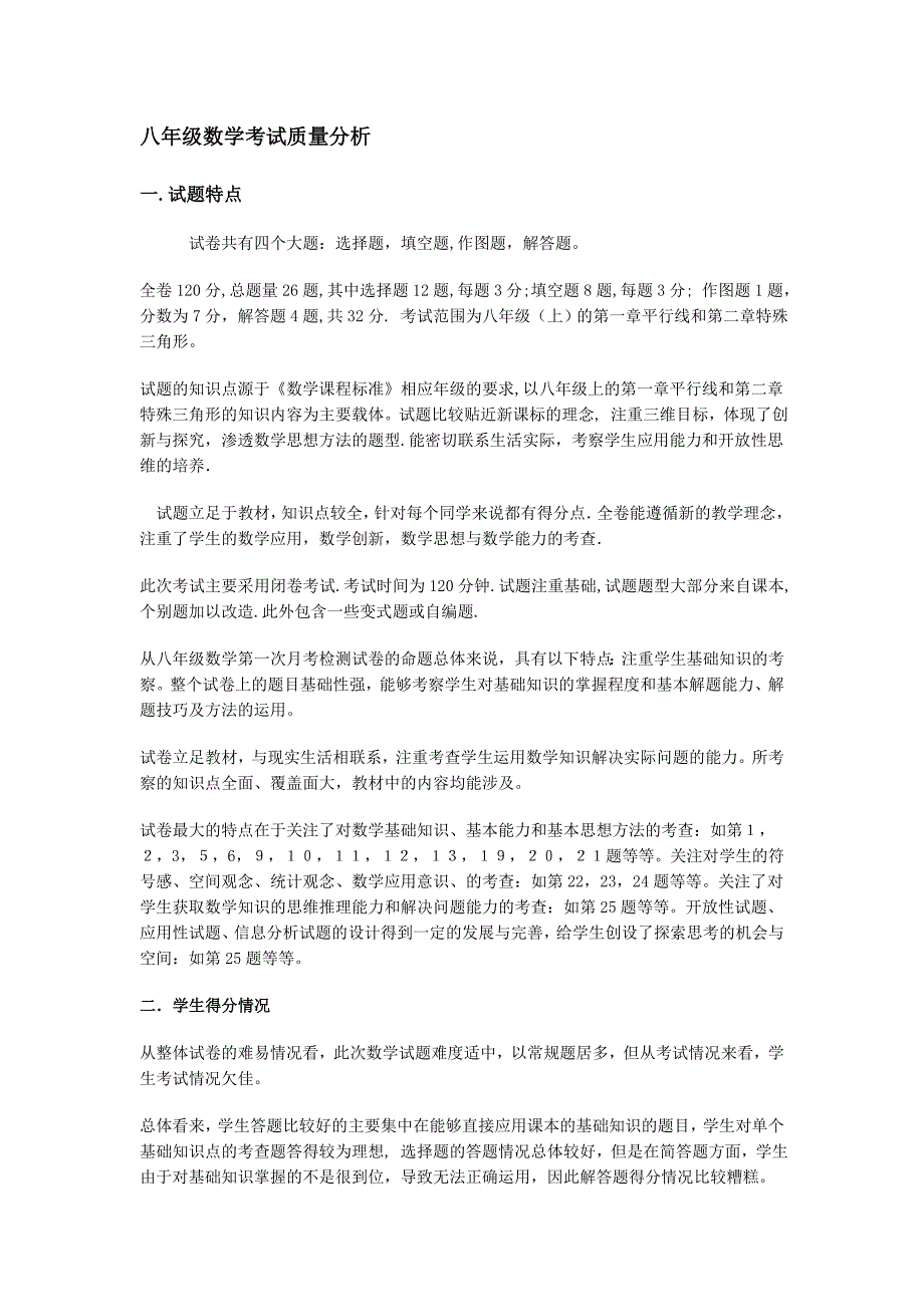八年级数学考试质量分析一.试题特点 试卷共有四个大题:选择题,填空题,作图题,解答题全卷120分,总题量26题,其中选择题12题,每题3分;填空题8题,每题3分; 作图题1题,分数为7分,解答题4题,共32分. 考试范围为八年级(上)的第一章平行线和第二章特殊三角形试题的知识点源于《数学课程标准》相应年级的要求,以八年级上的第一章平行线和第二章特殊三角形的知识内容为主要载体试题比较贴近新课标的理念, 注重三维目标,体现了创新与探究,渗透数学思想方法的题型.能密切联系生活实际,考察学生应用能力和开放性思维的培养. 试题立足于教材,知识点较全,针对每个同学来说都有得分点.全卷能遵循新的教学理念,注重了学生的数学应用,数学创新,数学思想与数学能力的考查.此次考试主要采用闭卷考试.考试时间为120分钟.试题注重基础,试题题型大部分来自课本,个别题加以改造.此外包含一些变式题或自编题.从八年级数学第一次月考检测试卷的命题总体来说,具有以下特点:注重学生基础知识的考察整个试卷上的题目基础性强,能够考察学生对基础知识的掌握程度和基本解题能力、解题技巧及方法的运用试卷立足教材,与现实生活相联系,注重考查学生运用数学知识解决实际问题的能力。