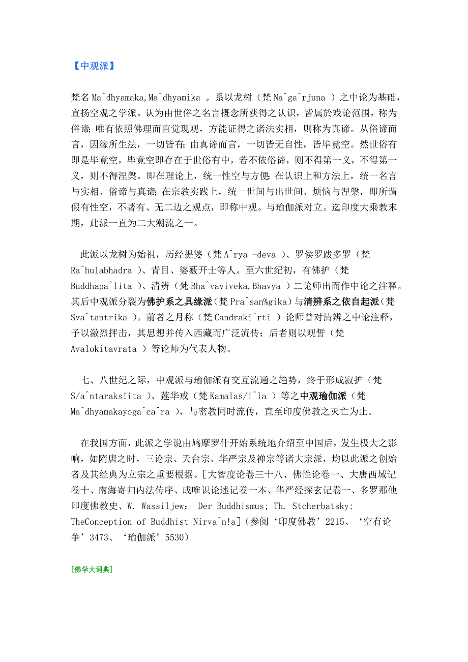 中观派】梵名Ma^dhyamaka,Ma^dhyamika 系以龙树(梵Na^ga^rjuna )之中论为基础,宣扬空观之学派认为由世俗之名言概念所获得之认识,皆属於戏论范围,称为俗谛;唯有依照佛理而直觉现观,方能证得之诸法实相,则称为真谛从俗谛而言,因缘所生法,一切皆有;由真谛而言,一切皆无自性,皆毕竟空然世俗有即是毕竟空,毕竟空即存在于世俗有中,若不依俗谛,则不得第一义,不得第一义,则不得涅槃即在理论上,统一性空与方便;在认识上和方法上,统一名言与实相、俗谛与真谛;在宗教实践上,统一世间与出世间、烦恼与涅槃,即所谓假有性空,不著有、无二边之观点,即称中观与瑜伽派对立迄印度大乘教末期,此派一直为二大潮流之一 此派以龙树为始祖,历经提婆(梵A^rya -deva )、罗侯罗跋多罗(梵Ra^hulabhadra )、青目、婆薮开士等人至六世纪初,有佛护(梵Buddhapa^lita )、清辨(梵Bha^vaviveka,Bhavya )二论师出而作中论之注释其后中观派分裂为佛护系之具缘派(梵Pra^san%gika )与清辨系之依自起派(梵Sva^tantrika )前者之月称(梵Candraki^rti )论师曾对清辨之中论注释,予以激烈抨击,其思想并传入西藏而广泛流传;后者则以观誓(梵Avalokitavrata )等论师为代表人物。