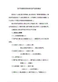 关于创建安全标准化加气站的建议安全生产标准化是预防事故、加强安全生产管理的重要基础,做好加气站安全生产标准化管理工作,对于保障员工的安全与健康,维护公司财产不受损坏具有非常重要的意义。我公司加气站安全标准化工作处于起步阶段,为做好此项工作,公司决定先以乌兰察布市荣洁燃气有限责任公司作为试点开展工作。创建安全标准化加气站工作分以下几方面:一、安全标识管理(一)、主体建筑形象标识(1)加气站顶棚:企业形象宣传标识——西部天气 LOGO 加公司名称。(2)进站口:进站标识——进站标识牌;禁止载客加气警示语——禁止载客加气。(3)出站口:出站标识——出站标识牌;谢谢惠顾感谢语——谢谢你的惠顾。(二)、加气区标识(1)售气机:售气机检验标识——售气机检验合格证书复印标识防撞标识——防撞栏(2)场区地面:车道标识——划分车道;进出标识——进出方向箭头;(3)警示标识:禁止吸烟标识、禁打手机标识、严禁烟火标识;(4)服务标识:天气预报栏、服务监督栏、服务信息栏。(5)公告标识:公告牌。(三)、站房标识(1)空压机房:闲人免进标识——闲人免进;禁止吸烟标识。(2)营业室(值班室):营业室(值班室)标识、工艺流程图、加气站资质证件(复印件)标识、人员资质证件(复印件)、禁止吸烟标识。(3)配电室:闲人免进标识、操作规程、小心触电、禁止吸烟标识。(4)洗手间:洗手间标识、禁止吸烟标识;文明使用标识——请放水冲洗、请投纸入筐(四)、设备区标识闲人免进标识、请穿防静电服标、易燃易爆标识、严禁烟火标识。(四)站区围墙:安全宣传标识、防火标识、禁打手机、 严禁烟火标识。内容 图片 使用地点禁止烟火 加油站二、安全档案建设管理安全管理档案包括环境保护管理档案、职业健康管理档案、安全生产管理档案、消防安全管理档案。(一)、纸质档案建设流程(1)环境保护管理、职业健康管理、消防安全管理档案根据本单位环境保护、职业健康、消防管理资料的多少购买一定数量的档案盒。制作档案封面及目录,(2)安全生产管理档案 收文发文管理分三个档案盒分别为公司安全管理发文、上级公司安全管理收文、地方监管单位收文。 安全教育培训按照培训计划将每月的安全培训记录情况进行归档。禁止打手机 加油站禁止吸烟 加油站当心火灾 加油站当心触电 加油站配电间 安全活动记录将安全生产月活动情况及每月的安全活动记录进行归档管理。 安全生产检查将每次的安全检查情况进行归档管理。 安全管理基础文件将安全方面的资质、人员资格证书、政府批文、安全评价报告等进行分类归档管理。 生产设备设施管理对生产设备设施建立设备台账、维修记录等进行归档管理 应急演练管理将各类演练预案及演练记录归档管理。(二)、电子档案建设流程参考以下管理方式在电脑上进行建档管理一级文件夹二级文件夹三级文件夹三、安全服务管理(一)、员工服务标准(1)上岗时应按公司规定统一着工装(参照西部天然气管道公司防静电工作服),清新整洁,左胸前配戴员工卡;仪表仪容端正,神态自然得体,精神饱满。(2)工作时间坚守岗位,做到人等客,顾客到站离开,要微笑迎送;(3)对待顾客说话要和气,用语文明,要使用“ 您好、请、谢谢、对不起、再见 ”等礼貌用语;(4)接待、洽谈要耐心热情,对顾客的询问,要做到有问必答,不厌其烦;(5)操作规范,CNG 计量准确,发现差错及时纠正,保障顾客利益;(6)收付钱物要唱收唱付,交代清楚,避免发生差错;记录字迹清楚、准确;(7)零钱要计算清楚,做到有零找零,无零让零;(8)工作态度认真,工作效率高,努力减少顾客排队等候时间;(9)对顾客一视同仁,做到加不加气一样热情,加多加少一样真诚,忙于不忙一样周到;(二)、服务态度(1)主动友善地招呼顾客,欢迎顾客光临。(2)主动了解顾客的要求,认真聆听顾客的意见和建议,最大限度地满足顾客的要求。(3)礼貌待客,微笑服务,态度谦和, 轻松自然。(4)对待顾客一视同仁,不轻视、不怠慢、不轻浮。(5)任何情况都不能与顾客发生争执,面对态度不好、无理取闹地顾客应保持冷静,把理让给顾客,妥善处理。(6)发现顾客有危害加气站安全的行为,应立即礼貌劝阻,在劝阻无效时必须强行制止。并及时将发生的情况向领导汇报。(三)、服务语言(1)使用文明用语,严禁使用不负责任的、歧视性和污蔑性的语言,杜绝忌 语。(2)吐字清晰、称呼恰当、问候亲切、 语气诚恳,做到来有迎声,问有答声,走有送声。(3)提倡使用普通话。(4)一般礼貌用语: 请! 请问,……吗? 请坐! 贵姓? 您好! 请拿好! 欢迎光临! 请走好! 对不起(很抱歉)! 请问您有什么事! 没关系(不客气,不要紧)! 请多提宝贵意见! 谢谢! 请稍等! 对不起,打扰您了! 您稍候,我马上就来! 对不起,让您久等了! 谢谢您的合作! 再见! 欢迎再次光临! 同事之间的称呼:姓+职务、姓名+ 职务、姓名 …… 请遵守加气站安全规定! 请核对一下!(5)使用服务用语顾客进站时应说:---你好!欢迎光临。---加气站规定车辆熄火后加气, 谢谢合作!---师傅,麻 烦您把车稍向前(后)一点!---对不起,根据国家安全 规定,严禁在加气站内打手机,请到站外去接听,谢谢合作。---请稍后, 马上给您加气。加气完毕结算时应说:---师傅,请 看表核对一下。---找您××钱,请拿好。---还有别的事需要帮忙吗?顾客离站时应说:---请走好。---再见