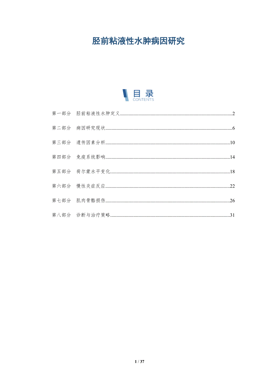 四、治疗1. 针对病因治疗:针对病因进行治疗,如控制甲状腺功能减退、糖尿病等2. 局部治疗:包括局部药物治疗、物理治疗等,如使用抗炎药物、免疫调节剂等3. 手术治疗:对于局部症状严重、药物治疗效果不佳的患者,可考虑手术治疗,如局部切除、皮肤移植等总之,胫前粘液性水肿是一种病因尚不明确的皮肤病变,临床表现为小腿胫前区域的肿胀、硬结和黏液性液体积聚了解PME的定义、病因、发病机制、临床表现、诊断及治疗对于临床医生具有重要意义进一步研究PME的病因和治疗方法,有助于提高患者的生活质量第二部分 病因研究现状关键词关键要点遗传因素与胫前粘液性水肿1. 遗传因素在胫前粘液性水肿的发病中起到关键作用,研究表明,某些遗传位点与该病的易感性密切相关2. 家族聚集性是胫前粘液性水肿的一个重要特征,提示遗传因素在发病机制中的重要性3. 基因组学研究和生物信息学技术的发展,为揭示遗传因素与胫前粘液性水肿的关系提供了新的视角和工具免疫调节异常与胫前粘液性水肿1. 胫前粘液性水肿的发病与免疫系统功能异常密切相关,炎症反应在疾病的发生发展中起关键作用2. 研究表明,T淋巴细胞、B淋巴细胞和巨噬细胞等免疫细胞在疾病过程中发挥重要作用。