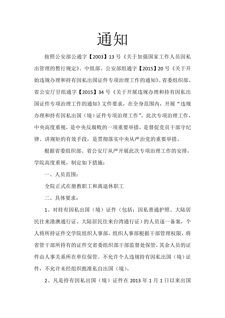 通知按照公安部公通字【2003】13 号《关于加强国家工作人员因私出管理的暂行规定》 、中组部、公安部组通字【2015】20 号《关于开始违规办理和持有因私出国证件专项治理工作的通知》 、省委组织部、省公安厅甘组通字【2015】34 号《关于开展违规办理和持有因私出国证件专项治理工作的通知》文件要求,在全身范围内,开展“违规办理和持有因私出国(境)证件专项治理工作” 此次专项治理工作,中央高度重视,是中央反腐败的一项重要举措,是督促党员干部守纪律、讲规矩的有效手段,是贯彻落实中央从严治党的重要举措根据省委组织部、省公安厅从严开展此次专项治理工作的安排,学院高度重视,制定如下措施:一、人员范围:全院正式在册教职工和离退休职工二、具体要求:1、对持有因私出国(境)证件(包括:因私普通护照、大陆居民往来港澳通行证、大陆居民往来台湾通行证)的人员逐一备案,个人将所持证件交学院组织人事部组织人事部根据干部管理权限,将省管干部所持有的证件交省委组织部干部监督处保管,其余人员的证件由人事关系所在单位保管不允许个人违规持有因私出国(境)证件,不允许未经组织批准私自出国(境) 2、凡是持有因私出国(境)证件在 2013 年 1 月 1 日以来出国(境)的,需详实向学院组织人事处登记备案,由学院组织人事处向省委组织部备案。