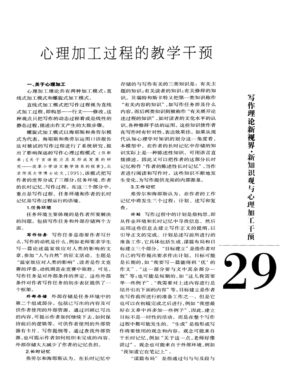 心理加工过程的教学干预 一、关于心理加工 心理/JN工理论共有两种加工模式:直 线式加工模式和螺旋式加_T模式 直线式加工模式把写作过程视为直线 式加丁过程,即构思——行文——修改,这 种观点只把写作的动态过程看成是线性的 静态过程,描述出作文产生的大致步骤 螺旋式加工模式以海耶斯和弗劳尔模 式为代表,海耶斯和弗劳尔运用口语报告 法对被试的写作过程进行了系统研究,提 出了影响深远的写作心理过程模式(伍新 春:《关于言语能力及其形成发展的研 究——改革小学语文教学体系的探索》,北 京师范大学博士论文,1 99 5),该模式把写 作者的世界分成了i部分:任务环境、作者 的长时记忆、写作过程在这乏个部分中, 重点是写作过程,任务环境和作者的长时 记忆是写作过程运行的语境 1.任务环境 任务环境主要体现的是作者所要解决 的问题包括写作任务和外部存储两个方 面 写作任务写作任务是指要作者写什 么,写作的动机是什‘么,例如老师要求学生 写一篇论述温室效应对人类的影响的文 章,参加“人与自然”的征文活动主题是 “温室效应对人类的影响”,读者是作文竞 赛的评委,动机则是在竞赛中取胜可见, 写作任务是对外部条件的界定,这些外部 条件对作者写作任务的初步表征提供了一 个框架。