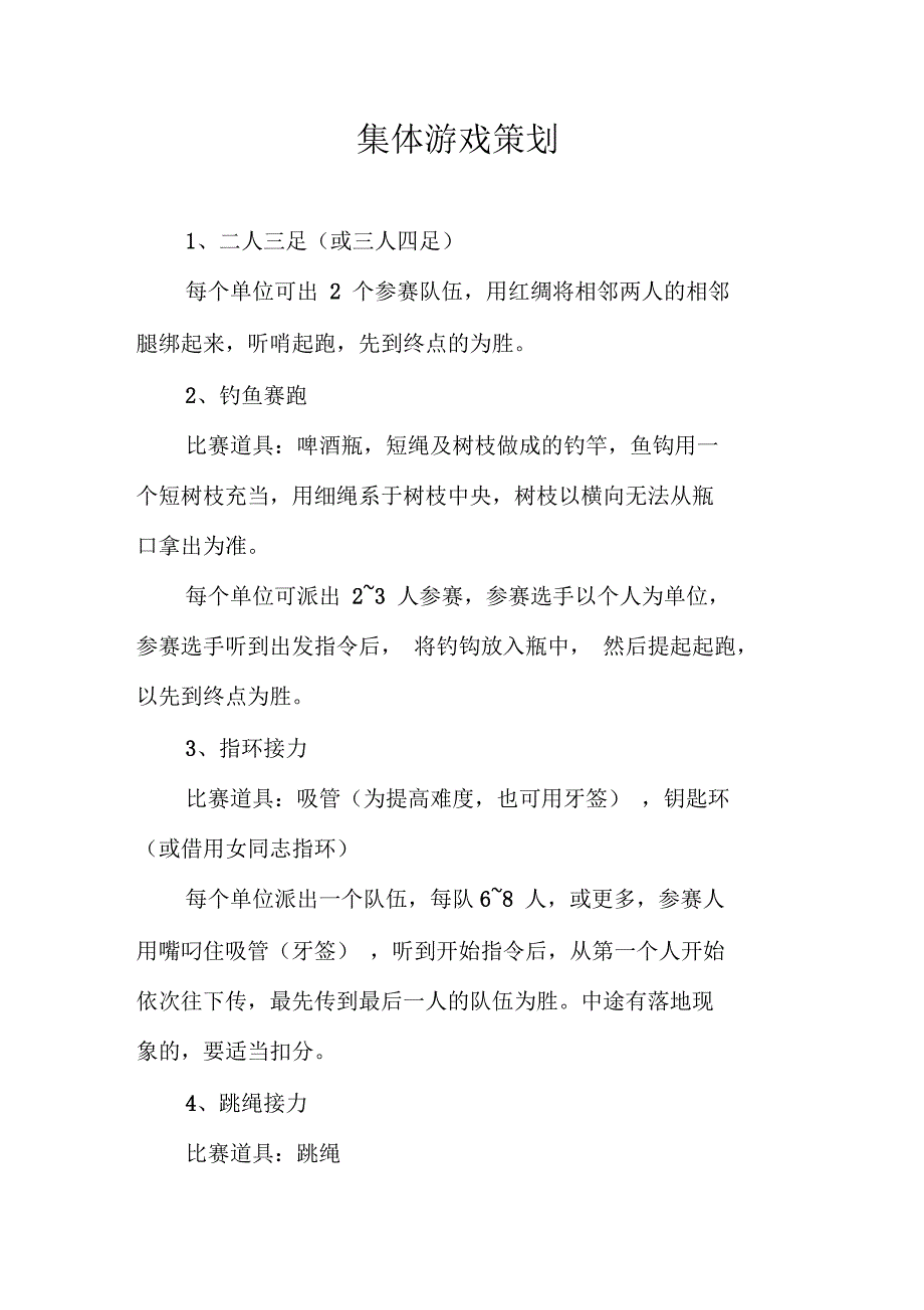 集体游戏策划1、二人三足(或三人四足)每个单位可出 2 个参赛队伍,用红绸将相邻两人的相邻腿绑起来,听哨起跑,先到终点的为胜2、钓鱼赛跑比赛道具:啤酒瓶,短绳及树枝做成的钓竿,鱼钩用一个短树枝充当,用细绳系于树枝中央,树枝以横向无法从瓶口拿出为准每个单位可派出 2~3 人参赛,参赛选手以个人为单位,参赛选手听到出发指令后, 将钓钩放入瓶中, 然后提起起跑,以先到终点为胜3、指环接力比赛道具:吸管(为提高难度,也可用牙签) ,钥匙环(或借用女同志指环)每个单位派出一个队伍,每队6~8 人,或更多,参赛人用嘴叼住吸管(牙签) ,听到开始指令后,从第一个人开始依次往下传,最先传到最后一人的队伍为胜中途有落地现象的,要适当扣分4、跳绳接力比赛道具:跳绳两个人摇绳,每个单位派出一组队员参赛( 6~8 人) ,开始摇绳后,在5 圈以内第一个人上绳,然后依次是5 次以内上一个人,统计直到跳坏了,上人最多的队伍为胜,人数同样多,以跳绳次数最多的队伍为胜5、定向爆破(挤爆气球)比赛道具:气球每个单位派出一个4 人的参赛队伍(如果时间允许,可玩 2 次) ,每个队伍发 16 只气球,同时抽签确定挤爆气球的身体部位(额头、胸、屁股、肚子等等) ,为增加难度和趣味性,可以让每个队伍的队员抽序号( 1 、 2 、 3、 4) ,事先约定 2、 3 号队员负责挤爆气球, 1、 4 号负责吹气球,得到开始指令后,两个人负责吹气球,令两个人按所抽纸签要求的部位将气球挤爆,最先完成挤爆十六只气球的队伍为胜。