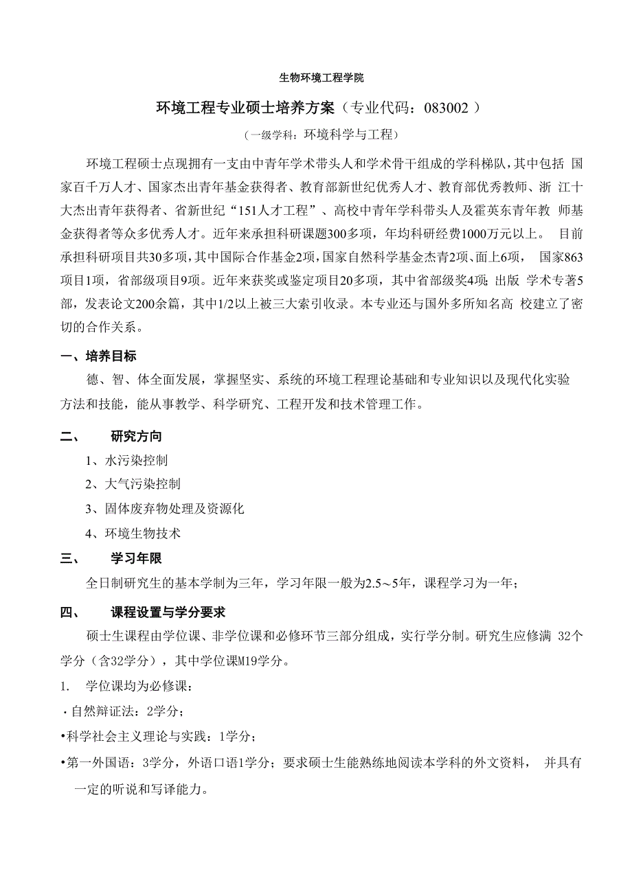 生物环境工程学院环境工程专业硕士培养方案(专业代码:083002 )(一级学科:环境科学与工程)环境工程硕士点现拥有一支由中青年学术带头人和学术骨干组成的学科梯队,其中包括 国家百千万人才、国家杰出青年基金获得者、教育部新世纪优秀人才、教育部优秀教师、浙 江十大杰出青年获得者、省新世纪“151人才工程”、高校中青年学科带头人及霍英东青年教 师基金获得者等众多优秀人才近年来承担科研课题300多项,年均科研经费1000万元以上 目前承担科研项目共30多项,其中国际合作基金2项,国家自然科学基金杰青2项、面上6项, 国家863项目1项,省部级项目9项近年来获奖或鉴定项目20多项,其中省部级奖4项;出版 学术专著5部,发表论文200余篇,其中1/2以上被三大索引收录本专业还与国外多所知名高 校建立了密切的合作关系―、培养目标德、智、体全面发展,掌握坚实、系统的环境工程理论基础和专业知识以及现代化实验 方法和技能,能从事教学、科学研究、工程开发和技术管理工作二、 研究方向1、 水污染控制2、 大气污染控制3、 固体废弃物处理及资源化4、 环境生物技术三、 学习年限全日制研究生的基本学制为三年,学习年限一般为2.5〜5年,课程学习为一年;四、 课程设置与学分要求硕士生课程由学位课、非学位课和必修环节三部分组成,实行学分制。