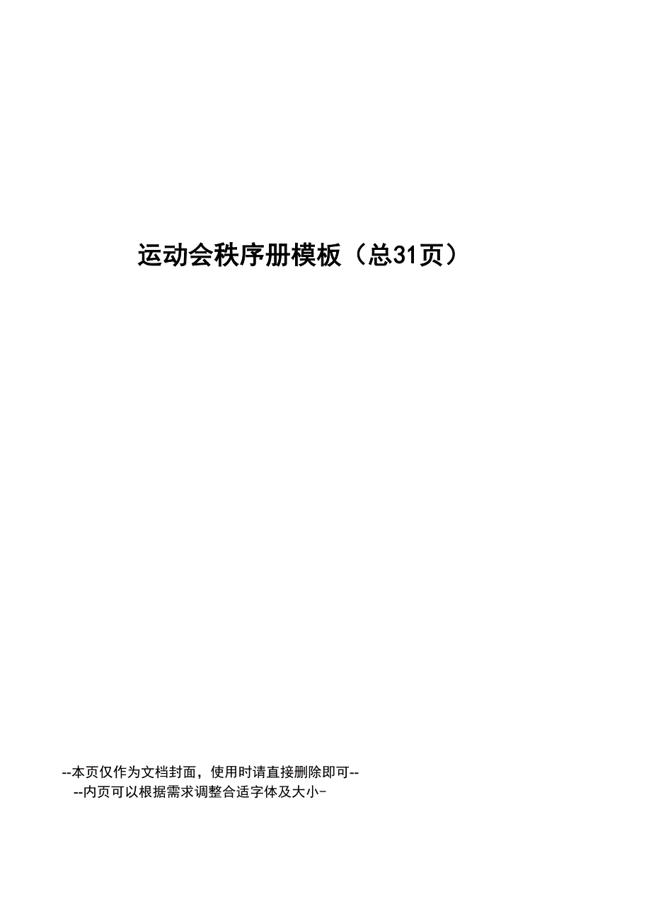 运动会秩序册模板(总31页)--本页仅作为文档封面,使用时请直接删除即可----内页可以根据需求调整合适字体及大小-一、大会组织委员会 二、大会办事机构 三、大会裁判员名单 五、大会作息时间 六、各代表队名单 七、竞赛日程 ...11八、竞赛分组 ...15九、运动会开幕式流程及要求 32黄金坳中心完小第十六届田径运动会大会组织机构组织委员会主 任:委 员:仲裁委员会:办事机构1、竞赛组组长:2、纪检保卫组组长:3、后 勤 组:4、播 音 组:5、编排记录公布组:6、体育器材组:裁判员名单总 裁判长:1、径赛裁判长: 终点计时裁判长 终点计时裁判员 终点记录员: 发 令 员: 起点检录员:2、田赛裁判长 裁判员:大会活动日程安排日期上午下午晚上备注10月21日运动会筹备会议,确定 竞赛项目及赛程10月24日第一次报名会,领取报 名表11月10日组织编排运动会秩序册11月19日准备场地,器材1. 裁判员临时实习2. 竞赛组检杳场地器材11月20日1开幕式(8:30)2.田径比赛 (10: 30—12:00)田径比赛(13: 30—16: 30)11月21日田径比赛 (8: 30—12:00)田径比赛(13: 30—14: 30) 闭幕式(14: 30)上午比赛:8:30——12:00中 餐:12:00下午比赛:13:30——16:00代表队名单(运动员号码对照表)一年级(1)班(1101——1120)领队兼教练: 人数:20男 子1101110211031104110511061107110811091110女 子1111111211131114111511161117111811191120一年级(2)班(1201——1220)领队兼教练: 人数男 子1201120212031204120512061207120812091210女 子1211121212131214121512161217121812191220一年级(3)班(1301——1320)领队兼教练: 人数:20男子1301130213031304130513061307130813091310女 子1311131213131314131513161317131813191320二年级(1)班(2101——2120)领队兼教练: 人数:20男子2101210221032104210521062107210821092110女 子2111211221132114211521162117211821192120二年级(2)班(2201——2220)男 子2201220222032204220522062207220822092210女 子2211221222132214221522162217221822192220领队兼教练:人数:20二年级(3)班(2301——2320)领队兼教练: 人数:20男 子2301230223032304230523062307230823092310女 子2311231223132314231523162317231823192320二年级(4)班(2401——2420)领队兼教练: 人数:20男子2401240224032404240524062407240824092410女 子2411241224132414241524162417241824192420三年级(1)班(3101——1120)领队兼教练: 人数:20男 子3101310231033104310531063107310831093110女子3111311231133114311531163117311831193120三年级(2)班(3201——3220)领队兼教练: 人数:20男 子3201320232033204320532063207320832093210女3211321232133214321532163217321832193220三年级(3)班(3301——3320)领队兼教练: 人数:20男 子3301330233033304330533063307330833093310女子3311331233133314331533163317331833193320三年级(4)班(3401——3420)领队兼教练: 人数:20男子3401340234033404340534063407340834093410女 子3411341234133414341534163417341834193420四年级(1)班(4101——4120)领队兼教练: 人数:20男子4101410241034104410541064107410841094110女 子4111411241134114411541164117411841194120四年级(2)班(4201——4220)领队兼教练: 人数:20男 子4201420242034204420542064207420842094210女 子4211421242134214421542164217421842194220四年级(3)班(4301——4320)领队兼教练: 人数:20男 子4301430243034304430543064307430843094310女 子4311431243134314431543164317431843194320四年级(4)班(4401——4420)领队兼教练: 人数:20男子4401440244034404440544064407440844094410女子4411441244134414441544164417441844194420五年级(1)班(5101——5120)领队兼教练: 人数:20男子5101510251035104510551065107510851095110女 子5111511251135114511551165117511851195120五年级(2)班(5201——5220)领队兼教练: 人数:20男 子5201520252035204520552065207520852095210女 子5211521252135214521552165217521852195220五年级(3)班(5301——5320)领队兼教练: 人数:20男子5301530253035304530553065307530853095310女子5311531253135314531553165317531853195320六年级(1)班(6101——6120)领队兼教练: 人数:20男 子6101610261036104610561066107610861096110女子6111611261136114611561166117611861196120六年级(2)班(6201——6220)领队兼教练: 人数:20男 子6201620262036204620562066207620862096210女 子6211621262136214621562166217621862196220六年级(3)班(6301——6320)领队兼教练: 人数:20男 子6301630263036304630563066307630863096310。