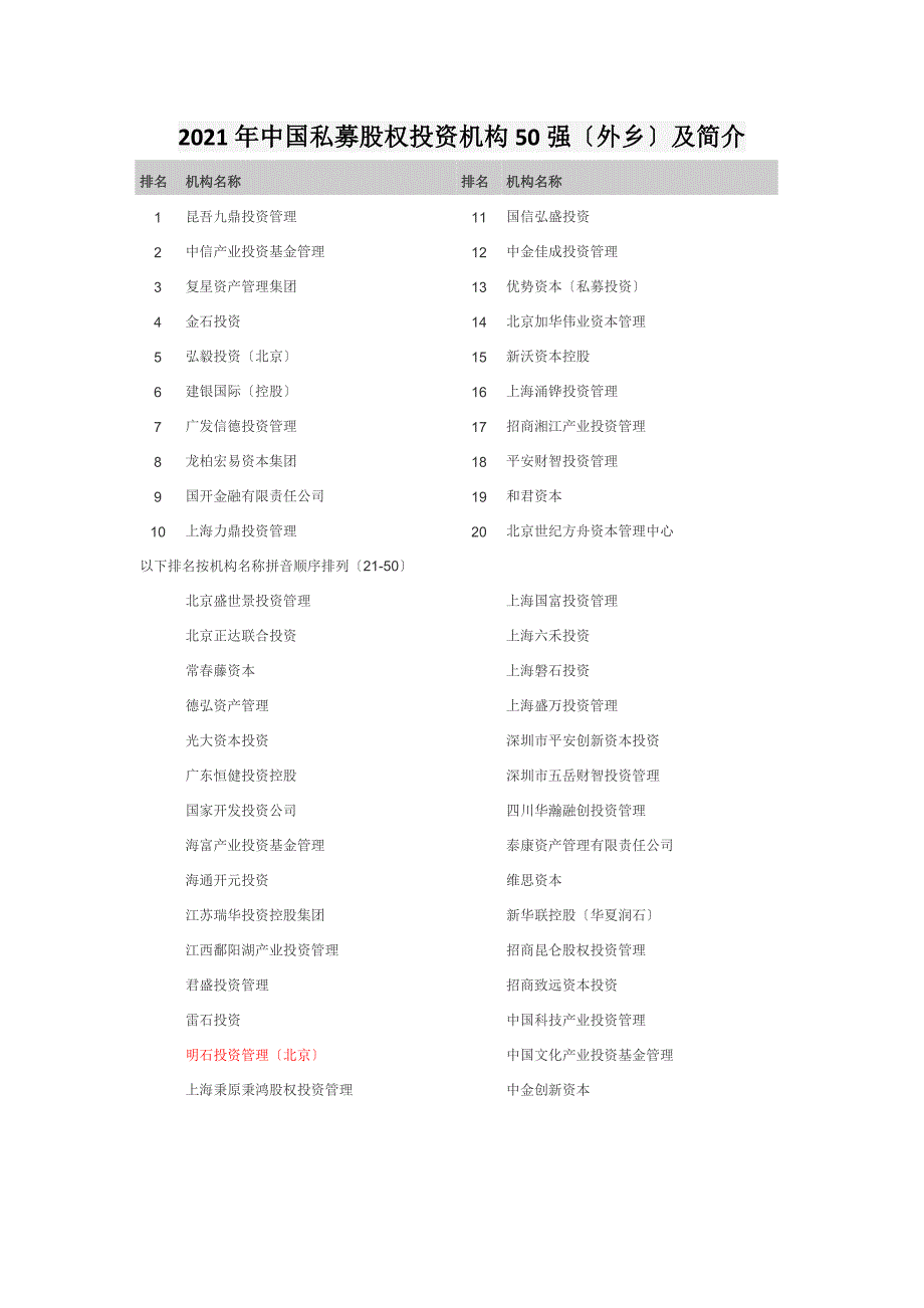 2021年中国私募股权投资机构50强〔外乡〕及简介 排名 机构名称 排名 机构名称 1 昆吾九鼎投资管理 11 国信弘盛投资 2 中信产业投资基金管理 12 中金佳成投资管理 3 复星资产管理集团 13 优势资本〔私募投资〕 4 金石投资 14 北京加华伟业资本管理 5 弘毅投资〔北京〕 15 新沃资本控股 6 建银国际〔控股〕 16 上海涌铧投资管理 7 广发信德投资管理 17 招商湘江产业投资管理 8 龙柏宏易资本集团 18 平安财智投资管理 9 国开金融有限责任公司 19 和君资本 10 上海力鼎投资管理 20 北京世纪方舟资本管理中心 以下排名按机构名称拼音顺序排列〔21-50〕 北京盛世景投资管理 上海国富投资管理 北京正达联合投资 上海六禾投资 常春藤资本 上海磐石投资 德弘资产管理 上海盛万投资管理 光大资本投资 深圳市平安创新资本投资 广东恒健投资控股 深圳市五岳财智投资管理 国家开发投资公司 四川华瀚融创投资管理 海富产业投资基金管理 泰康资产管理有限责任公司 海通开元投资 维思资本 江苏瑞华投资控股集团 新华联控股〔华夏润石〕 江西鄱阳湖产业投资管理 招商昆仑股权投资管理 君盛投资管理 招商致远资本投资 雷石投资 中国科技产业投资管理 明石投资管理〔北京〕 中国文化产业投资基金管理 上海秉原秉鸿股权投资管理 中金创新资本 1昆吾九鼎投资管理 昆吾九鼎投资管理〔简称九鼎投资〕,是一家专注于股权投资及管理的专业机构。