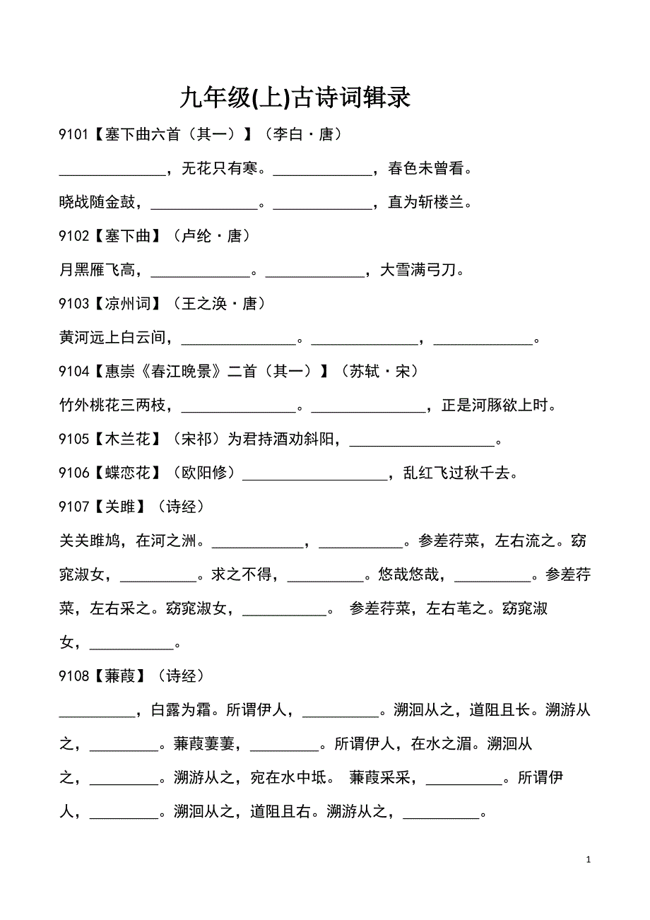 1九年级九年级(上上)古诗词辑录古诗词辑录9101【塞下曲六首(其一)】(李白·唐),无花只有寒 ,春色未曾看晓战随金鼓, ,直为斩楼兰 9102【塞下曲】(卢纶·唐)月黑雁飞高, ,大雪满弓刀9103【凉州词】(王之涣·唐)黄河远上白云间, , 9104【惠崇《春江晚景》二首(其一)】(苏轼·宋)竹外桃花三两枝, ,正是河豚欲上时 9105【木兰花】(宋祁)为君持酒劝斜阳, 9106【蝶恋花】(欧阳修) ,乱红飞过秋千去9107【关雎】(诗经)关关雎鸠,在河之洲 , 参差荇菜,左右流之窈窕淑女, 求之不得, 悠哉悠哉, 参差荇菜,左右采之窈窕淑女, 。