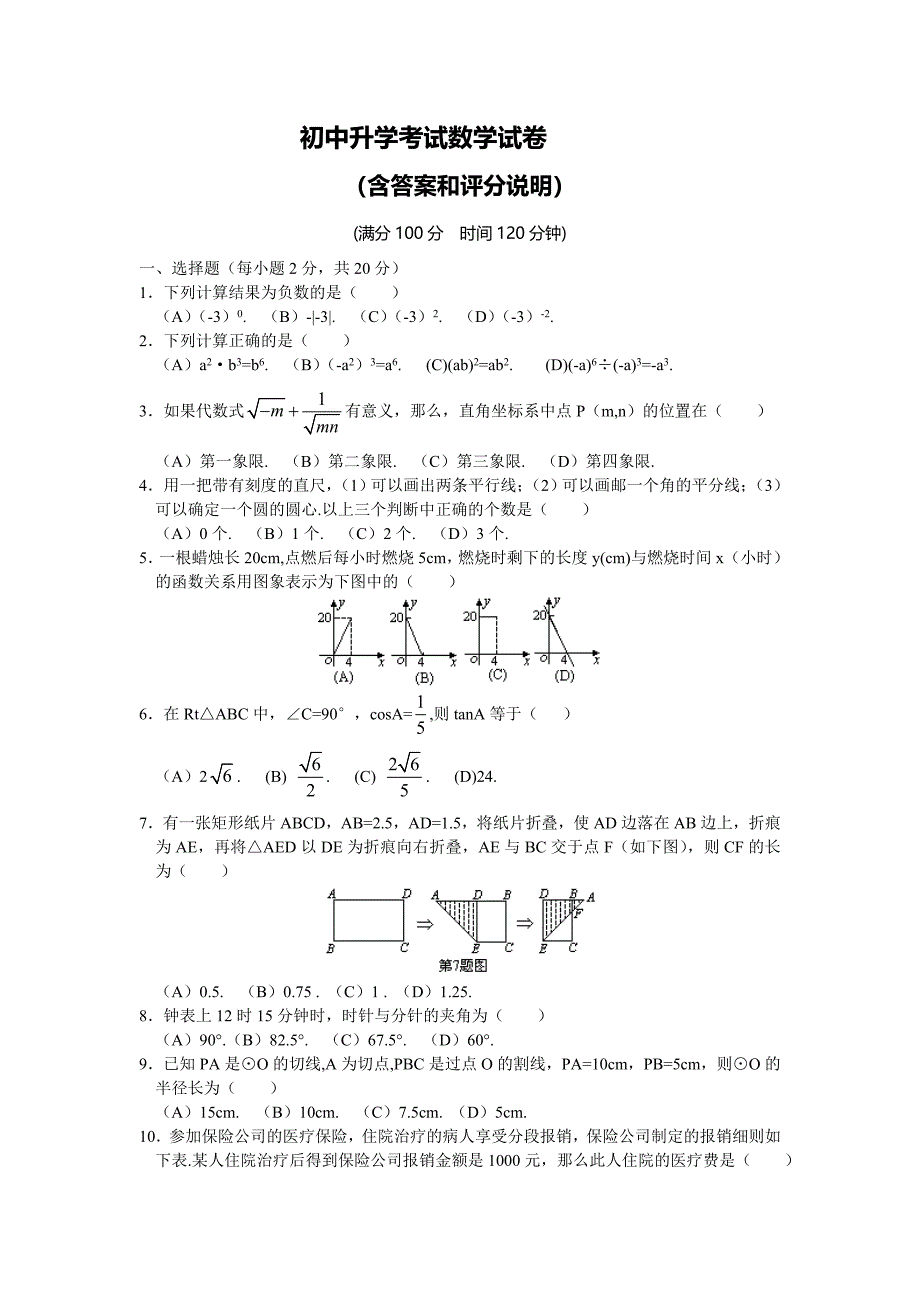 初中升学考试数学试卷(含答案和评分说明)(满分100分 时间120分钟)一、选择题(每小题2分,共20分)1.下列计算结果为负数的是( )(A)(-3)0. (B)-|-3|. (C)(-3)2. (D)(-3)-2.2.下列计算正确的是( )(A)a2·b3=b6. (B)(-a2)3=a6. (C)(ab)2=ab2. (D)(-a)6÷(-a)3=-a3.3.如果代数式有意义,那么,直角坐标系中点P(m,n)的位置在( )(A)第一象限. (B)第二象限. (C)第三象限. (D)第四象限.4.用一把带有刻度的直尺,(1)可以画出两条平行线;(2)可以画邮一个角的平分线;(3)可以确定一个圆的圆心.以上三个判断中正确的个数是( )(A)0个. (B)1个. (C)2个. (D)3个.5.一根蜡烛长20cm,点燃后每小时燃烧5cm,燃烧时剩下的长度y(cm)与燃烧时间x(小时)的函数关系用图象表示为下图中的( )6.在Rt△ABC中,∠C=90°,cosA=,则tanA等于( )(A)2. (B) . (C) . (D)24.7.有一张矩形纸片ABCD,AB=2.5,AD=1.5,将纸片折叠,使AD边落在AB边上,折痕为AE,再将△AED以DE为折痕向右折叠,AE与BC交于点F(如下图),则CF的长为( )(A)0.5. (B)0.75 . (C)1 . (D)1.25.8.钟表上12时15分钟时,时针与分针的夹角为( )(A)90°.(B)82.5°. (C)67.5°. (D)60°.9.已知PA是⊙O的切线,A为切点,PBC是过点O的割线,PA=10cm,PB=5cm,则⊙O的半径长为( )(A)15cm. (B)10cm. (C)7.5cm. (D)5cm.10.参加保险公司的医疗保险,住院治疗的病人享受分段报销,保险公司制定的报销细则如下表.某人住院治疗后得到保险公司报销金额是1000元,那么此人住院的医疗费是( )住院医疗费(元)报销率(%)不超过500的部分0超过500~1000的部分60超过1000~3000的部分80…………(A)1000元. (B)1250元. (C)1500元. (D)2000元.二、填空题(每小题3分,共30分)11.在数轴上,与表示-1的点距离为3的点所表示的数是____________.12.已知数据:1,2,1,0,-1,-2,0,-1,这组数据的方差为____________.13.多项式x2+px+12可分解为两个一次因式的积,整数p的值是________.(写出一个即可)14.某音像公司对外出租光盘的收费方法是:每张光盘出租的前2天每天收费0.8元,以后每天收费0.5元,那么一张光盘在出租后第n天(n>2且为整数)应收费________元.15.不等式组的解集为______________.16.如图,已知方格纸中是4个相同的正方形,则∠1+∠2+∠3=________.17.在平面直角坐标系中,入射光线经过y轴上的点A(0,3),由x轴上的点C反射,反射光线经过点B(-3,1),则点C的坐标为____________.18.农村常需搭建截面为半圆形的全封闭蔬菜塑料暖房(如图所示),则需塑料布y(m2)与截面半径R(m)的函数关系式是(不考虑塑料埋在土里的部分):______________.19.已知直角三角形两边x、y的长满足|x2-4|+=0,则第三边的长为___________.20.在一次主题为“学会生存”的中学生社会实践活动中,春华同学为了锻炼自己,他通过了解市场行情,以每件6元的价格从批发市场购进若干件印有2008年北京奥运标志的文化衫到自由市场去推销,当销售完30件之后,销售金额达到300元,余下的每件降价2元销售,很快推销完毕,此时销售金额达到380元,春华同学在这次活动中获得纯收入____________元.三、解答题(本大题有8个小题,共70分)21.(6分)先化简后求值:÷(x+2-),其中x=2.22.(6分)为了测量汉江某段河面的宽度,秋实同学设计了如下的测量方案:先在河的北岸选定一点A,再在河的南岸选定相距a米的两点B、C(如图),分别测得∠ABC=α,∠ACB=β.请你根据秋实同学测得的数据.计算出河宽AD(结果用含a和含α、β的三角函数表示).23.(8分)青少年视力水平的下降已经引起社会的关注.某学校为了了解初中毕业年级500名学生的视力情况,从中抽查了一部分学生视力,通过数据处理,得到如下频率分布表和频率分布直方图.请你根据给出的图表回答:(1)填写频率分布表中未完成部分的数据.(2)在这个问题中,总体__________________________________是,样本容量是____.(3)在频率分布直方图中,梯形ABCD的面积是______________.(4)请你用样本估计总体,可以得到哪些信息(写一条即可):____________________.24.(8分)已知关于x的方程x2-(k+1)x+k2+1=0的两根是一个矩形两邻边的长.(1)k取何值时,方程有两个实数根?(2)当矩形的对角线长为时,求k的值.25.(10分)已知:如图,四边形ABCD内接于圆,延长AD、BC相交于点E,点F是BD延长线上的点,且DE平分∠CDF.(1)求证:AB=AC;(2)若AC=3cm,AD=2cm.求DE的长.26.(10分)在△ABC中,借助作图工具可以作出中位线EF,沿着中位线EF一刀剪切后,用得到的△AEF和四边形EBCF可以拼成平行四边形EBCP,剪切线与拼图如图示1.仿上述方法,按要求完成下列操作设计,并在规定位置画出图示.(1)在△ABC中,增加条件:_________________,沿着________一刀剪切后可以拼成矩形,剪切线与拼图画在图示2的位置.(2) 在△ABC中,增加条件:_________________,沿着________一刀剪切后可以拼成菱形,剪切线与拼图画在图示3的位置.(3) 在△ABC中,增加条件:_________________,沿着________一刀剪切后可以拼成正方形,剪切线与拼图画在图示4的位置.(4) 在△ABC(ABAC)中,一刀剪切后也可以拼成等腰梯形,首先要确定剪切线,其操作过程(剪切线的作法)是:___________________________________________________,然后沿着剪切线一刀剪切后可以拼成等腰梯形,剪切线与拼图画在图示5的位置.27.(10分)某校初中三年级270名师生计划集体外出一日游,乘车往返.经与客运公司联系,他们有座位数不同的中巴车和大客车两种车型可供选择,每辆大客车比每辆中巴车多15个座位.学校根据中巴车和大客车的座位数计算后得知,如果租用中巴车若干辆,师生刚好坐满全部座位;如果租用大客车,不仅少用一辆,而且师生坐完后还多30个座位.(1)求中巴车和大客车各有多少个座位?(2)客运