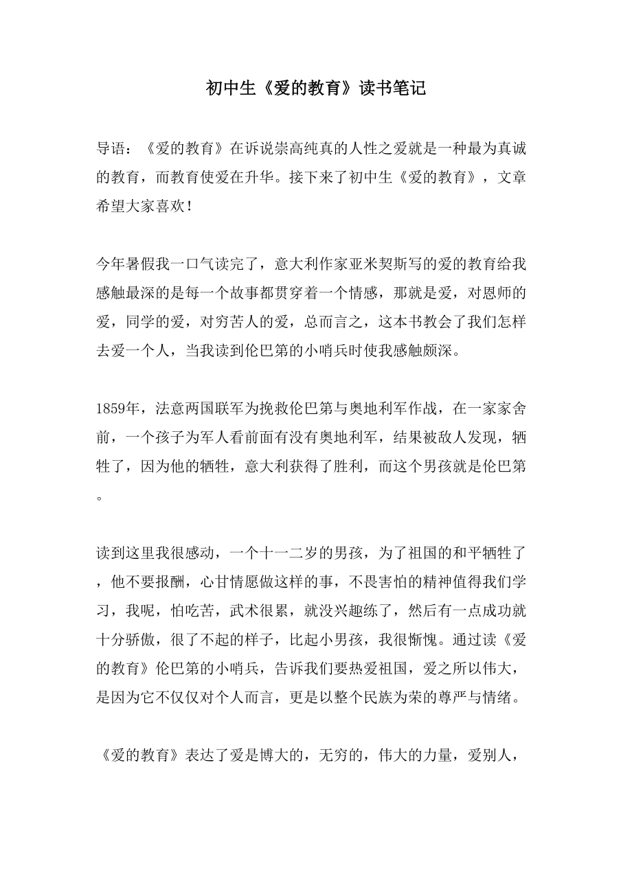 初中生《爱的教育》读书笔记 导语:《爱的教育》在诉说崇高纯真的人性之爱就是一种最为真诚的教育,而教育使爱在升华接下来了初中生《爱的教育》,文章希望大家喜欢! 今年暑假我一口气读完了,意大利作家亚米契斯写的爱的教育给我感触最深的是每一个故事都贯穿着一个情感,那就是爱,对恩师的爱,同学的爱,对穷苦人的爱,总而言之,这本书教会了我们怎样去爱一个人,当我读到伦巴第的小哨兵时使我感触颇深 1859年,法意两国联军为挽救伦巴第与奥地利军作战,在一家家舍前,一个孩子为军人看前面有没有奥地利军,结果被敌人发现,牺牲了,因为他的牺牲,意大利获得了胜利,而这个男孩就是伦巴第 读到这里我很感动,一个十一二岁的男孩,为了祖国的和平牺牲了,他不要报酬,心甘情愿做这样的事,不畏害怕的精神值得我们学习,我呢,怕吃苦,武术很累,就没兴趣练了,然后有一点成功就十分骄傲,很了不起的样子,比起小男孩,我很惭愧通过读《爱的教育》伦巴第的小哨兵,告诉我们要热爱祖国,爱之所以伟大,是因为它不仅仅对个人而言,更是以整个民族为荣的尊严与情绪 《爱的教育》表达了爱是博大的,无穷的,伟大的力量,爱别人,传递爱,让大家都能感受到温暖,“只要人人都献出一点爱,世界将变成美好的人间”。