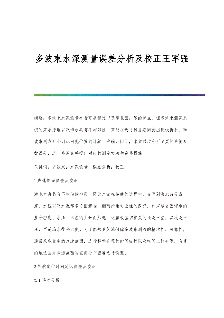 相对精度评估是借助一定的精准线的测量,对水深的测量数据的精度分分析具有较高的参考价值,可以分析在除了自身的系统因素之外的综合性的误差分析,对数据的整体分析具有较高的参考价值,选择天气和地响等影响较小的时间和地点进行测试,减少客观因素的影响,在中央水深以及边缘水深方面进行相对的平衡测量,获得较为科学的数据4.3绝对精度评估绝对精度评估是整个系统精度中要求最高的,不仅是因为精度较高,还因为绝对精度是在静态精度评估和相对精度评估的基础上进行的因为绝对精度的评估是在系统精度符合相关的精度规定时,对整个精度的进一步提高,可以从可控影响方面入手,也可以通过提高测量仪器的精度进行实验,利用高精度的测量仪器5结束语本文通过对声速剖面误差、导航定位时间误差、横摇偏角和纵倾偏角误差的各方面因素进行了全方位分析,提出相对应的校正措施但这并不代表可以万无一失地保障测量数据的无误,在实际当中,很多误差都是随机出现的,会受到各种各样的原因影响,甚至有的目前还未考虑到,这些误差之间相互作用、相互影响,又会形成新的误差,在很大程度上给误差来源判断增加了难度,所以,需要相应的技术人员培养足够的经验,努力提高自身的业务水平,尽量规避测量出现误差。