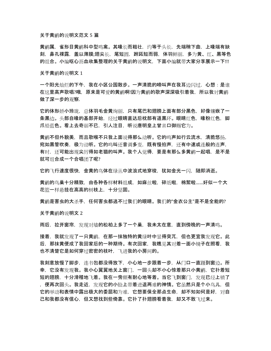 关于黄鹂的说明文范文5篇黄鹂属,雀形目黄鹂科中型鸣禽其喙长而粗壮,约等于头长,先端稍下曲,上喙端有缺刻,鼻孔裸露,盖以薄膜;翅尖长,尾短圆,跗跖短而弱,体羽鲜丽,多为黄、红、黑等色的组合小编呕心沥血收集整理的关于黄鹂的说明文,下面小编就带大家分享展示一下!!!关于黄鹂的说明文1一个阳光灿烂的下午,我在小区公园散步一声清脆的啼叫声在我耳边闪过,心想:是谁在这里高声歌唱?哦,原来是可爱的黄鹂啊!因为黄鹂的歌声深深吸引着我,所以我对黄鹂做了深一步的观察.它的体形娇小玲珑,总体羽毛金黄绚丽,只有尾巴和翅膀上面有部分黑色,好像镶嵌了一条黑边头部自喙的基部开始,经过眼睛直达后枕部有道黑环眼睛红色,喙粉红色,脚爪铅蓝色看上去奇丽不已,引人注目,听说唐明皇上曾亲口御赐它为黄鹂不但外貌美,而且歌喉不只我上面说得那么动听它的鸣声如行云流水,清脆悠扬,宛如黑管吹奏,极为动听它的鸣叫还音调多变,既有慢拍声,还有中速或连般的连声,有时,还可能出现尖厉得如老猫的叫声我个人觉得,要是有那么多黄鹂一起唱,是不是就可组合成一个合唱团了呢?它的飞行速度很快,金黄的鸟体在绿丛中波浪式地穿梭,犹如金光一闪,随即消逝黄鹂的鸟巢十分精致,由各种各样材料组成,如麻丝啦,碎纸啦,棉絮啦……好似一个大花篮一样悬挂在高高的树枝上,十分坚固。