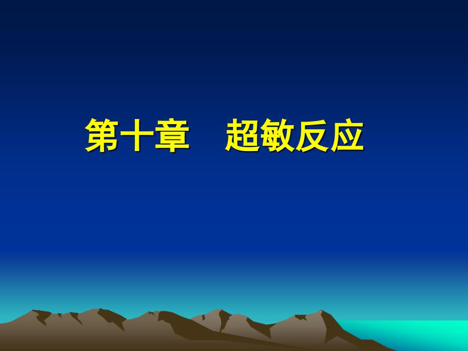 2.血清过敏性休克动物血清:抗毒素血清,如破伤抗毒素血清和白喉抗毒素血清,(二)呼吸道过敏反应过敏原:尘土、花粉、霉菌、动物皮屑或呼 吸道感染等常见病:过敏性鼻炎和过敏性哮喘 (三)消化道过敏反应过敏原:鱼、虾、蛋、奶及一些药物常见病:过敏性胃肠炎 (四)皮肤过敏反应过敏原:多种抗原,或冷热刺激、日光照 射、肠内寄生虫感染等常见病:荨麻疹、湿疹、皮炎、神经血管性水肿四.Ⅰ型超敏反应的防治原则 (一)检出抗原并避免接触查找过敏原:● 可通过询问病史和皮试来完成;● 皮试法 (二)急性脱敏治疗(acute desensitization)方法:采用小量(0.1ml、0.2ml、0.3ml),短间隔(20~30分钟)、多次注射;应用:外毒素所致疾病危及生命又对抗毒素血清 过敏者三)慢性脱敏治疗(chronic desensitization)方法:采用微量(g、ng),长时间反复多次皮下注射应用:已查明且难以避免接触的环境中抗原如尘土、花粉、螨虫、霉菌类等的病人 (四)药物治疗1.抑制免疫功能的药物药物:地塞米松、氢化可的松等作用:a.抑制单核细胞、T、B细胞功能;b.消炎2.抑制生物活性介质释放的药物(1)色苷酸二钠:--- 稳定肥大细胞膜,阻止脱颗粒;(2)肾上腺素、异丙肾上腺素及儿茶酚胺类和前列腺素E:--- 激活腺苷酸环化酶,增加cAMP的合成;氨茶碱:--- 抑制磷酸二脂酶,阻止cAMP的分解。