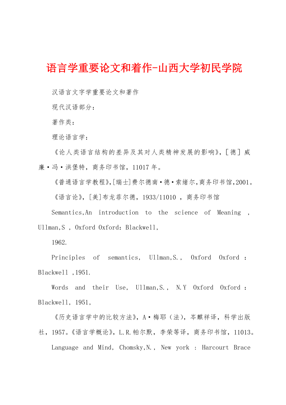 语言学重要论文和着作-山西大学初民学院 汉语言文字学重要论文和著作 现代汉语部分: 著作类: 理论语言学: 《论人类语言结构的差异及其对人类精神发展的影响》,[德]威廉·冯·洪堡特,商务印书馆,11017年 《普通语言学教程》,[瑞士]费尔德南·德·索绪尔,商务印书馆,2001 《语言论》,[美]布龙菲尔德,1933/11010 ,商务印书馆 Semantics,An introduction to the science of Meaning , Ullman,S , Oxford Oxford:Blackwell, 1962. Principles of semantics, Ullman,S., Oxford Oxford:Blackwell ,1951. Words and their Use, Ullman,S., N.Y Oxford Oxford:Blackwell, 1951, 《历史语言学中的比较方法》,A·梅耶(法),岑麒祥译,科学出版社,1957。