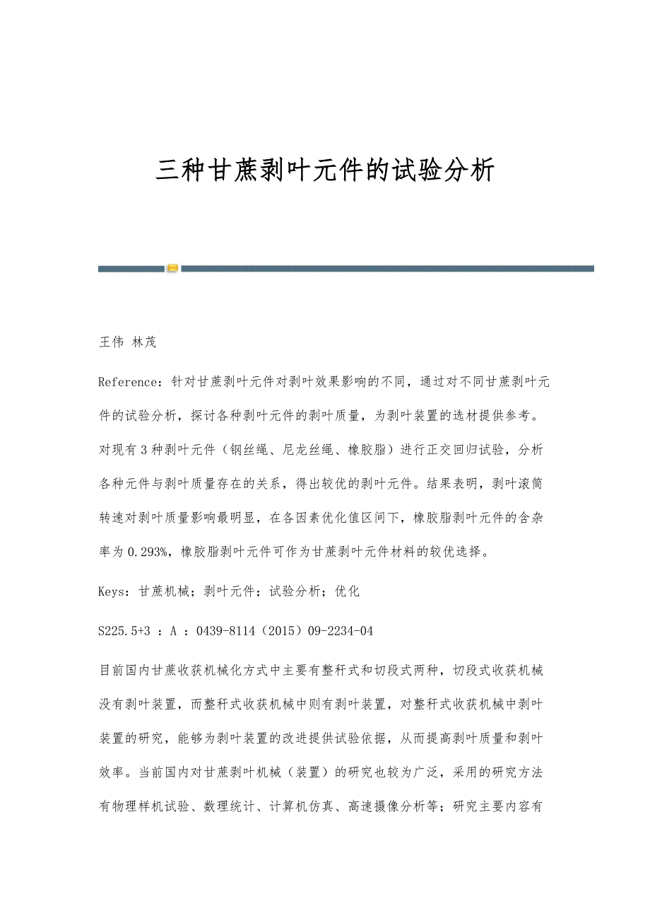 三种甘蔗剥叶元件的试验分析 王伟 林茂Reference:针对甘蔗剥叶元件对剥叶效果影响的不同,通过对不同甘蔗剥叶元件的试验分析,探讨各种剥叶元件的剥叶质量,为剥叶装置的选材提供参考对现有3种剥叶元件(钢丝绳、尼龙丝绳、橡胶脂)进行正交回归试验,分析各种元件与剥叶质量存在的关系,得出较优的剥叶元件结果表明,剥叶滚筒转速对剥叶质量影响最明显,在各因素优化值区间下,橡胶脂剥叶元件的含杂率为0.293%,橡胶脂剥叶元件可作为甘蔗剥叶元件材料的较优选择Keys:甘蔗机械;剥叶元件;试验分析;优化S225.5+3 :A :0439-8114(2015)09-2234-04目前国内甘蔗收获机械化方式中主要有整秆式和切段式两种,切段式收获机械没有剥叶装置,而整秆式收获机械中则有剥叶装置,对整秆式收获机械中剥叶装置的研究,能够为剥叶装置的改进提供试验依据,从而提高剥叶质量和剥叶效率当前国内对甘蔗剥叶机械(装置)的研究也较为广泛,采用的研究方法有物理样机试验、数理统计、计算机仿真、高速摄像分析等;研究主要内容有剥叶装置的结构设计、各运动部件参数、剥叶元件的选材、寿命和剥叶质量等,其中剥叶元件的选材、寿命及剥叶质量是目前研究的热点和难点。