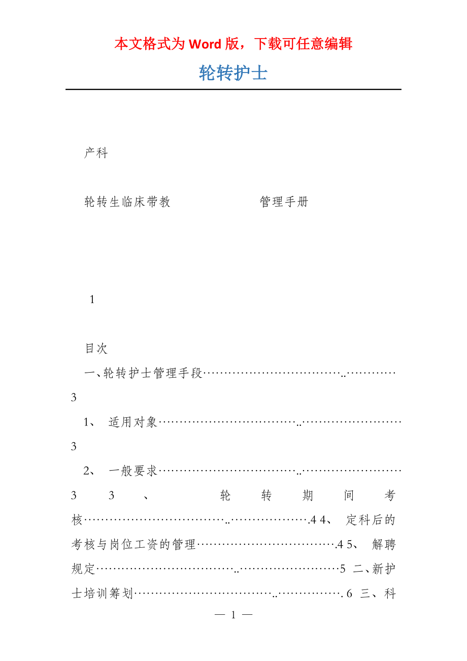 本文格式为Word版,下载可任意编辑轮转护士 产科 轮转生临床带教 管理手册 1 目次 一、轮转护士管理手段……………………………..…………3 1、 适用对象……………………………..……………………3 2、 一般要求……………………………..……………………3 3、 轮转期间考核……………………………..……………….4 4、 定科后的考核与岗位工资的管理…………………………….4 5、 解聘规定……………………………..……………………5 二、新护士培训筹划……………………………..……………. 6 三、科内轮转护士带教老师职责………………………………7 1. 护理临床总带教老师职责………………………….……..…...7 2. “一对一”分带教老师职责…………………………….…...…7 三、轮转护士入科带教流程图……….……………………..…9 四、科内轮转护士带教方案…….………………………….…10 1.入科与出科评估表……………………………..……………….11 2.轮转护士带教筹划……………………………..………………12 3.科内常见病护理及健康宣教………………………………..…..18 附录:1.常用根基操作及三基理论带教调配表………………………....41 2.轮转护士综合评价表………………………...……………………..49 3.专科操作考核评价标准………..…………………………………50 4轮转护士对科室带教合意度评价表……………………………..59 2 一. 轮转护士管理手段 随着医院的不断进展,护理队伍在不断扩大,轮转护士是临床护理工作的新生气力,也是护理管理的重点人群,为模范轮转护士管理特制订本管理手段: 一、本手段适用对象:凡通过人事部门雇用进院的护士,生活护士,生活护士转正后的护士、。