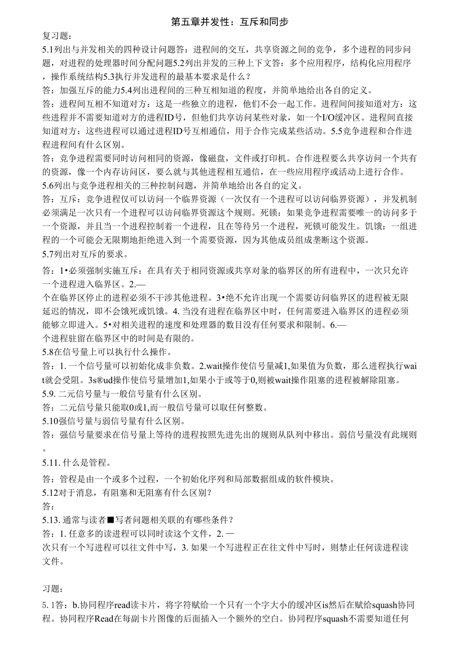 第五章并发性:互斥和同步复习题:5.1列出与并发相关的四种设计问题答:进程间的交互,共享资源之间的竞争,多个进程的同步问题,对进程的处理器时间分配问题5.2列出并发的三种上下文答:多个应用程序,结构化应用程序,操作系统结构5.3执行并发进程的最基本要求是什么?答:加强互斥的能力5.4列出进程间的三种互相知道的程度,并简单地给出各自的定义答:进程间互相不知道对方:这是一些独立的进程,他们不会一起工作进程间间接知道对方:这些进程并不需要知道对方的进程ID号,但他们共享访问某些对彖,如一个I/O缓冲区进程间直接知道对方:这些进程可以通过进程ID号互相通信,用于合作完成某些活动5.5竞争进程和合作进程进程间有什么区别答:竞争进程需要同时访问相同的资源,像磁盘,文件或打印机合作进程要么共享访问一个共有的资源,像一个内存访问区,要么就与其他进程相互通信,在一些应用程序或活动上进行合作5.6列出与竞争进程相关的三种控制问题,并简单地给出各自的定义答:互斥:竞争进程仅可以访问一个临界资源(一次仅有一个进程可以访问临界资源),并发机制必须满足一次只有一个进程可以访问临界资源这个规则死锁:如果竞争进程需要唯一的访问多于一个资源,并且当一个进程控制着一个进程,且在等待另一个进程,死锁可能发生。