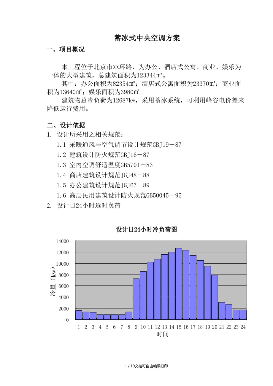 蓄冰式中央空调方案一、项目概况本工程位于北京市XX环路,为办公、酒店式公寓、商业、娱乐为一体的大型建筑,总建筑面积为123344㎡其中:办公面积为82354㎡;酒店式公寓面积为23370㎡;商业面积为13640㎡;娱乐面积为3980㎡ 建筑物总冷负荷为12687kw,采用蓄冰系统,可利用峰谷电价差来降低运行费用 二、设计依据1. 设计所采用之相关规范: 1.1 采暖通风与空气调节设计规范GBJ19-87 1.2 建筑设计防火规范GBJ16-87 1.3 室内空调舒适温度GB5701-83 1.4 商店建筑设计规范JGJ48-88 1.5 办公建筑设计规范JGJ67-89 1.6 高层民用建筑设计防火规范GB50045-952. 设计日24小时逐时负荷三、空调冷热源设计方案根据夏季24小时空调负荷情况,使用CIAT专用冰蓄冷软件计算,得出蓄冰空调方案模式如下:选择一台1900kw冷水机组作为基载主机,24小时运行,满足夜间全部负荷和日间部分负荷同时选择三台1917kw的双工况冷水机组,夜间电力低谷时段蓄冰工况运行,向蓄冰设备蓄得冷量日间三台双工况机组空调工况运行,与蓄冰设备一起向末端供应冷量,能量分配如下:* 基载主机能量输出:1900 kw * 双工况主机日间空调工况能量输出:5751 kw * 双工况主机夜间制冰工况平均能量输出:4216 kw * 蓄冷设备夜间储存的可利用冷量: 33377 kwh* 蓄冷设备日间溶冰最大输出能量: 5036 kw设计日100%负荷情况下系统运行策略如下:1. 0:00-24:00:一台基载机组空调工况运行。