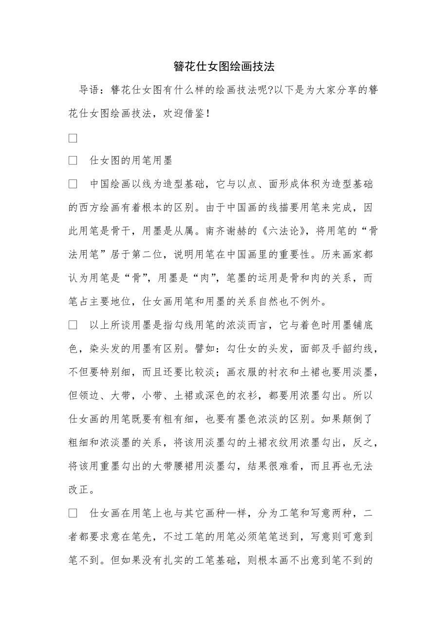 簪花仕女图绘画技法 导语:簪花仕女图有什么样的绘画技法呢?以下是为大家分享的簪花仕女图绘画技法,欢迎借鉴! 仕女图的用笔用墨 中国绘画以线为造型基础,它与以点、面形成体积为造型基础的西方绘画有着根本的区别由于中国画的线描要用笔来完成,因此用笔是骨干,用墨是从属南齐谢赫的《六法论》,将用笔的“骨法用笔”居于第二位,说明用笔在中国画里的重要性历来画家都认为用笔是“骨”,用墨是“肉”,笔墨的运用是骨和肉的关系,而笔占主要地位,仕女画用笔和用墨的关系自然也不例外 以上所谈用墨是指勾线用笔的浓淡而言,它与着色时用墨铺底色,染头发的用墨有区别譬如:勾仕女的头发,面部及手韶约线,不但要特别细,而且还要比较淡;画衣服的衬衣和土裙也要用淡墨,但领边、大带,小带、土裙或深色的衣衫,都要用浓墨勾出所以仕女画的用笔既要有粗有细,也要有墨色浓淡的区别如果颠倒了粗细和浓淡墨的关系,将该用淡墨勾的土裙衣纹用浓墨勾出,反之,将该用重墨勾出的大带腰裙用淡墨勾,结果很难看,而且再也无法改正 仕女画在用笔上也与其它画种—样,分为工笔和写意两种,二者都要求意在笔先,不过工笔的用笔必须笔笔送到,写意则可意到笔不到但如果没有扎实的工笔基础,则根本画不出意到笔不到的写意仕女画,也无法提炼以少胜多的简笔描的写意仕女形象。