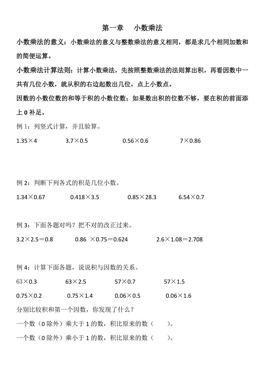 第一章 小数乘法小数乘法的意义:小数乘法的意义与整数乘法的意义相同,都是求几个相同加数和的简便运算小数乘法计算法则:计算小数乘法,先按照整数乘法的法则算出积,再看因数中一共有几位小数,就从积的右边起数出几位,点上小数点因数的小数位数的和等于积的小数位数;如果数出积的位数不够,要在积的前面添上0补足例1:列竖式计算,并且验算1.35×4 3.7×0.5 0.56×0.6 7×0.86例2:判断下列各式的积是几位小数1.34×0.67 0.418×3.5 0.85×28.3 6.54×0.7 例3:下面各题对吗?把不对的改正过来3.2×2.5=0.8 0.86 ×0.75=0.624 2.6×1.08=2.708例4:计算下面各题,说说积与因数的关系63×0.3 63×2.5 57×0.7 57×1.50.75×0.2 0.75×1.4 0.06×0.5 0.06×1.6分别比较积和第一个因数,你发现了什么?一个数(0除外)乘大于1的数,积比原来的数( )。
